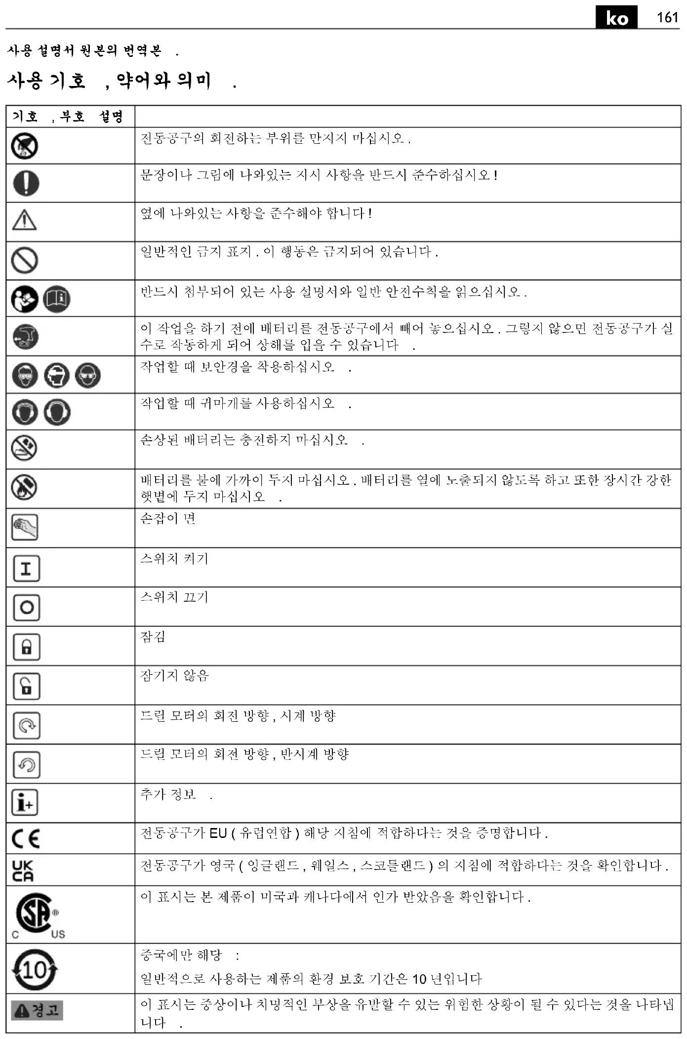 전동공구가 EU ( 유럽연합 ) 해당 지침에 적합하다는 것을 증명합니다 . 전동공구가 영국 ( 잉글랜드 , 웨일스 , 스코틀랜드 ) 의 지침에 적합하다는 것을 확인합니다 . 이 표시는 본 제품이 미국과 캐나다에서 인가 받았음을 확인합니다 .