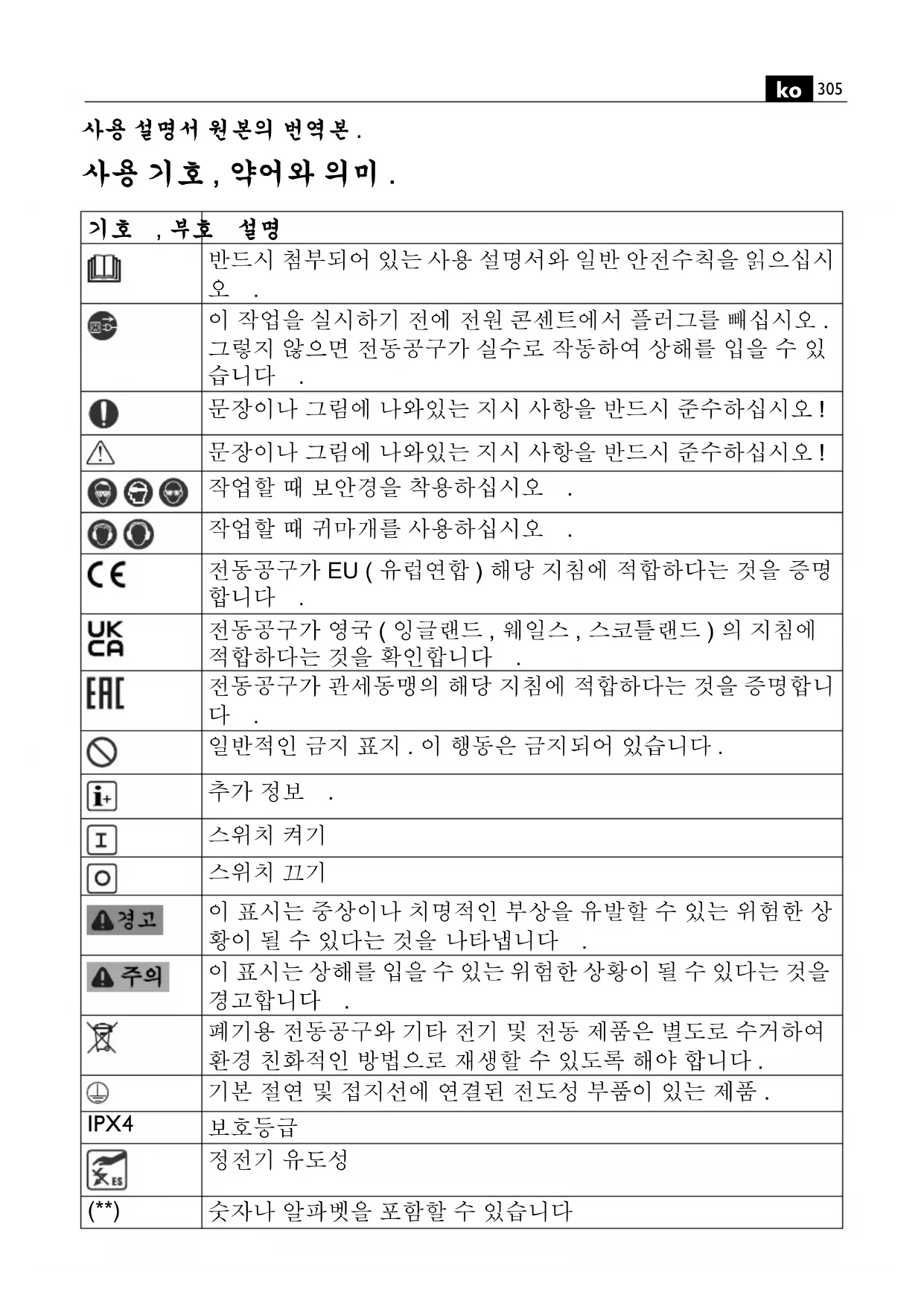 사용 설명서 원본의 번역본 . 사용 기호 , 약어와 의미 .
