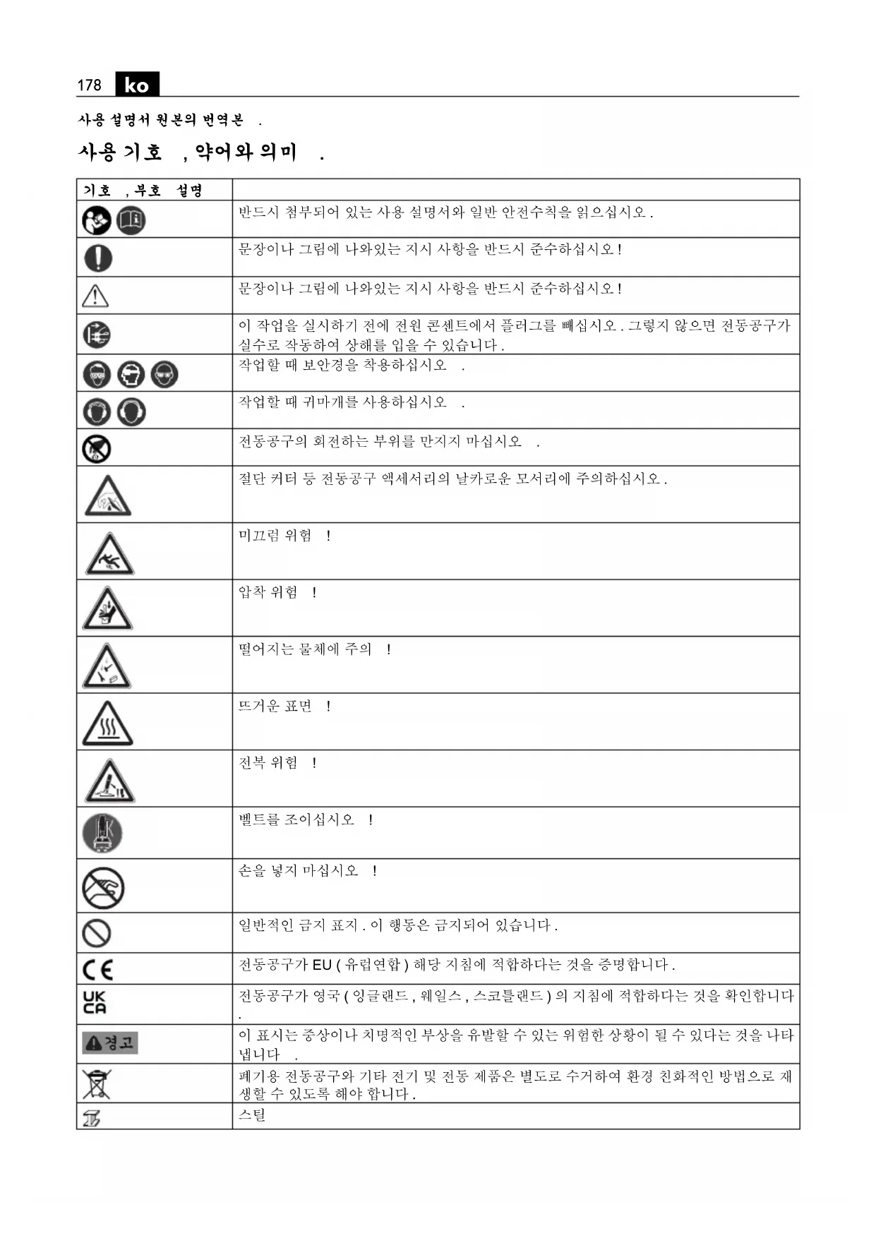 벨트를 조이십시오 ! 손을 넣지 마십시오 ! 일반적인 금지 표지 . 이 행동은 금지되어 있습니다 . 전동공구가 EU ( 유럽연합 ) 해당 지침에 적합하다는 것을 증명합니다 . 전동공구가 영국 ( 잉글랜드 , 웨일스 , 스코틀랜드 ) 의 지침에 적합하다는 것을 확인합니다