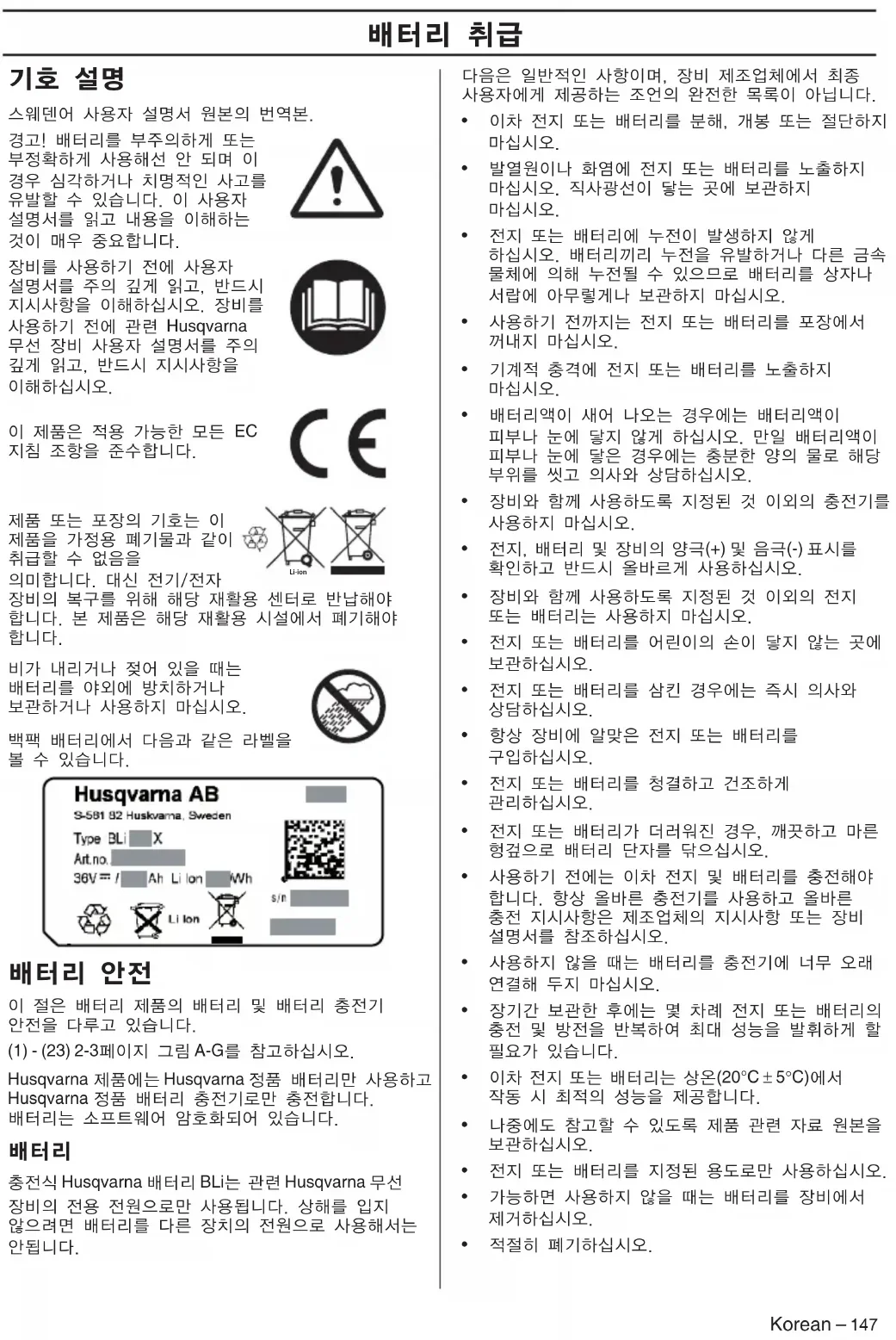 스웨덴어 사용자 설명서 원본의 번역본. 경고! 배터리를 부주의하게 또는 부정확하게 사용해선 안 되며 이 경우 심각하거나 치명적인 사고를 유발할 수 있습니다. 이 사용자 설명서를 읽고 내용을 이해하는 것이 매우 중요합니다. 장비를 사용하기 전에 사용자 설명서를 주의 깊게 읽고, 반드시 지시사항을 이해하십시오. 장비를 사용하기 전에 관련 Husqvarna 무선 장비 사용자 설명서를 주의 깊게 읽고, 반드시 지시사항을