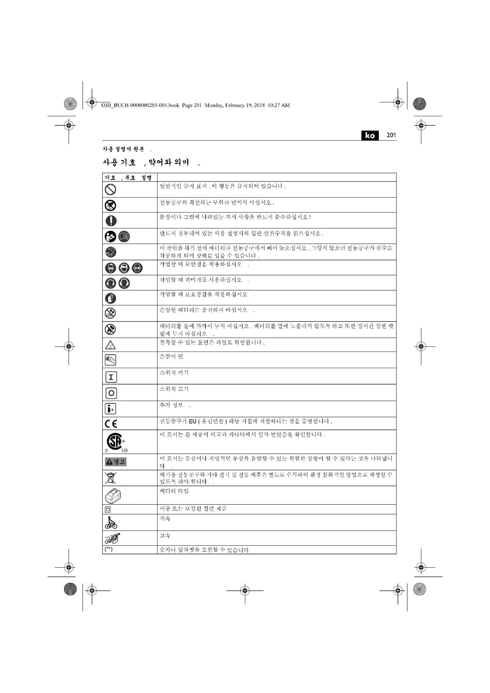 일반적인 금지 표지 . 이 행동은 금지되어 있습니다 . 전동공구의 회전하는 부위를 만지지 마십시오 . 문장이나 그림에 나와있는 지시 사항을 반드시 준수하십시오 ! 반드시 첨부되어 있는 사용 설명서와 일반 안전수칙을 읽으십시오 . 이 작업을 하기 전에 배터리를 전동공구에서 빼어 놓으십시오 . 그렇지 않으면 전동공구가 실수로 작동하게 되어 상해를 입을 수 있습니다 . 작업할 때 보안경을 착용하십시오 . 작업할 때 귀마개를 사용하십시오 . 작업할 때 보호장갑을 착용하십시오 . 손상된 배터리는 충전하지 마십시오 . 배터리를 불에 가까이 두지 마십시오 . 배터리를 열에 노출되지 않도록 하고 또한 장시간 강한 햇 볕에 두지 마십시오 . 접촉할 수 있는 표면은 과열로 위험합니다 .