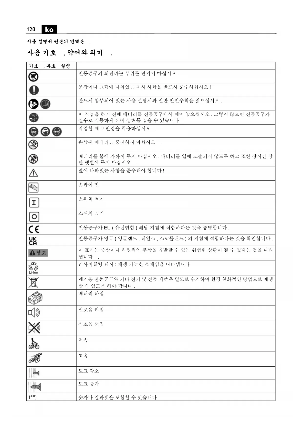전동공구가 EU ( 유럽연합 ) 해당 지침에 적합하다는 것을 증명합니다 . 전동공구가 영국 ( 잉글랜드 , 웨일스 , 스코틀랜드 ) 의 지침에 적합하다는 것을 확인합니다 . 이 표시는 중상이나 치명적인 부상을 유발할 수 있는 위험한 상황이 될 수 있다는 것을 나타
