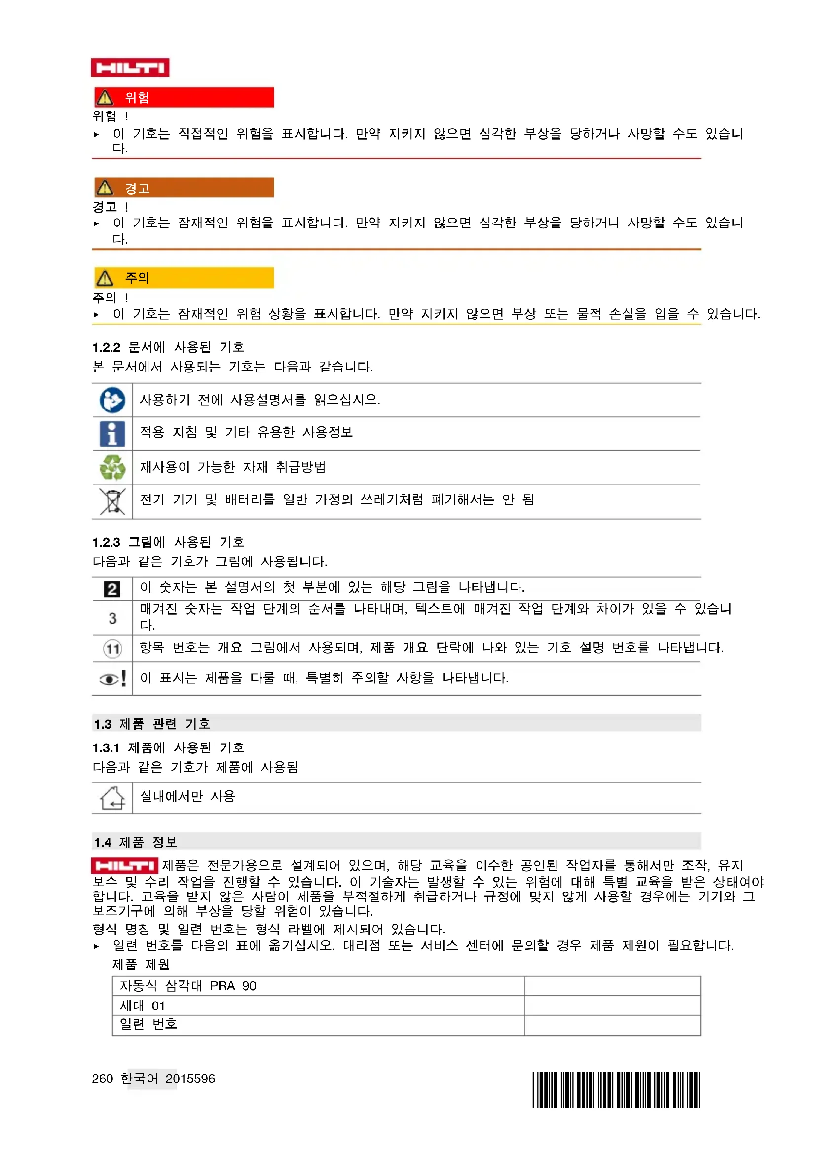 폐사는 전적으로 책임을 지고 여기에 기술된 제품이 통용되는 기준과 규격에 일치함을 공표합니다. 적합성 증 명서 사본은 본 문서 끝 부분에서 확인할 수 있습니다. 기술 문서는 이곳에 기술되어 있습니다. Hilti Entwicklungsgesellschaft mbH | Zulassung Geräte | Hiltistraße 6 | 86916 Kaufering, DE 2 안전