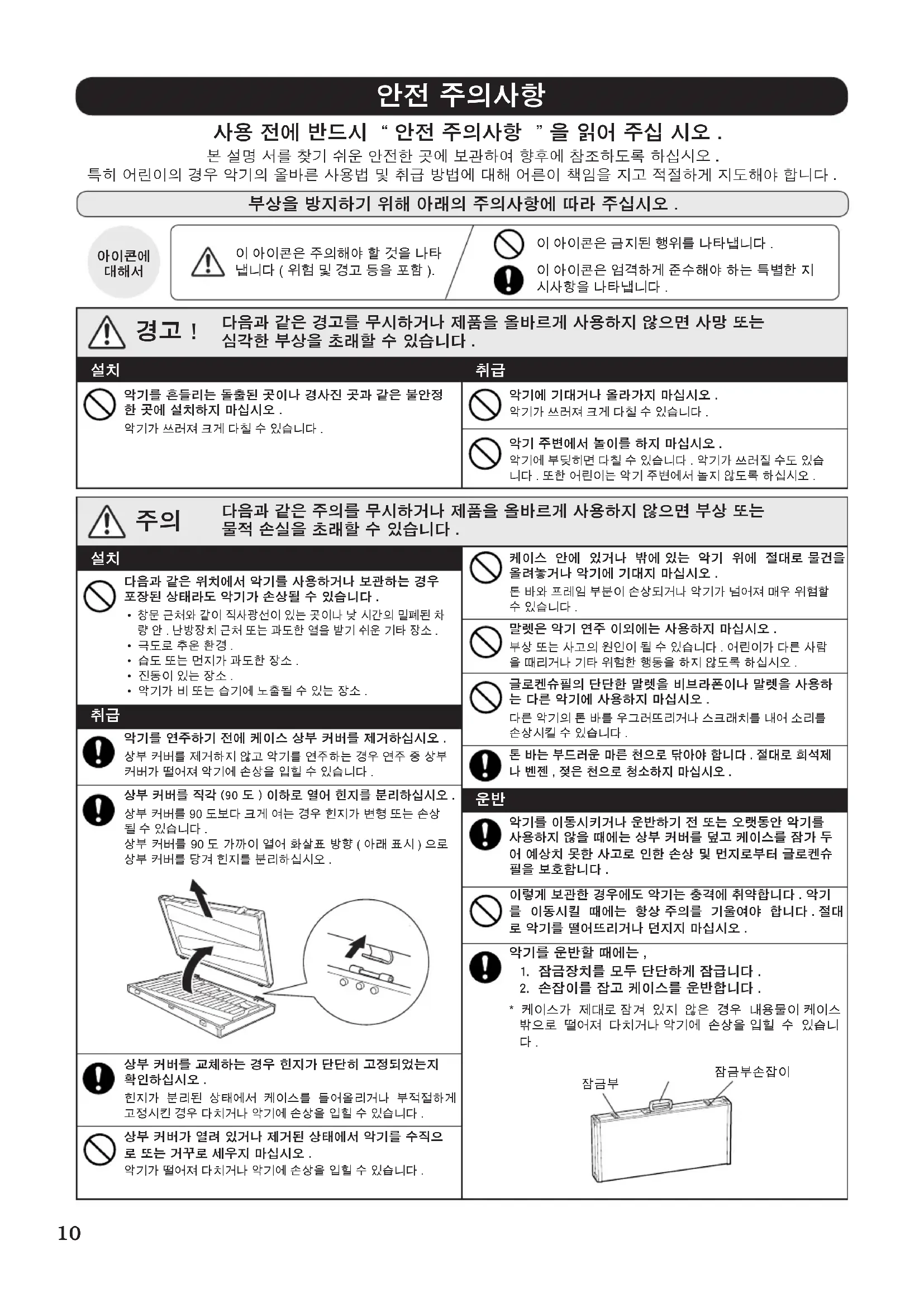 잠금부손잡이이 아이콘은 금지된 행위를 나타냅니다 .이 아이콘은 엄격하게 준수해야 하는 특별한 지시사항을 나타냅니다 . 다음과 같은 위치에서 악기를 사용하거나 보관하는 경우 포장된 상태라도 악기가 손상될 수 있습니다 . 창문 근처와 같이 직사광선이 있는 곳이나 낮 시간의 밀폐된 차량 안 . 난방장치 근처 또는 과도한 열을 받기 쉬운 기타 장소 .• 극도로 추운 환경 .• 습도 또는 먼지가 과도한 장소 .• 진동이 있는 장소 .• 악기가 비 또는 습기에 노출될 수 있는 장소 . 악기를 연주하기 전에 케이스 상부 커버를 제거하십시오 .상부 커버를 제거하지 않고 악기를 연주하는 경우 연주 중 상부 커버가 떨어져 악기에 손상을 입힐 수 있습니다 .상부 커버를 직각 (90 도 ) 이하로 열어 힌지를 분리하십시오 . 상부 커버를 90 도보다 크게 여는 경우 힌지가 변형 또는 손상될 수 있습니다 . 상부 커버를 90 도 가까이 열어 화살표 방향 ( 아래 표시 ) 으로 상부 커버를 당겨 힌지를 분리하십시오 .상부 커버를 교체하는 경우 힌지가 단단히 고정되었는지 확인하십시오 .힌지가 분리된 상태에서 케이스를 들어올리거나 부적절하게 고정시킨 경우 다치거나 악기에 손상을 입힐 수 있습니다 .상부 커버가 열려 있거나 제거된 상태에서 악기를 수직으로 또는 거꾸로 세우지 마십시오 .악기가 떨어져 다치거나 악기에 손상을 입힐 수 있습니다 . 다음과 같은 경고를 무시하거나 제품을 올바르게 사용하지 않으면 사망 또는 심각한 부상을 초래할 수 있습니다 . 다음과 같은 주의를 무시하거나 제품을 올바르게 사용하지 않으면 부상 또는 물적 손실을 초래할 수 있습니다 . 케이스 안에 있거나 밖에 있는 악기 위에 절대로 물건을 올려놓거나 악기에 기대지 마십시오 .톤 바와 프레임 부분이 손상되거나 악기가 넘어져 매우 위험할 수 있습니다 .말렛은 악기 연주 이외에는 사용하지 마십시오 .부상 또는 사고의 원인이 될 수 있습니다 . 어린이가 다른 사람을 때리거나 기타 위험한 행동을 하지 않도록 하십시오 .글로켄슈필의 단단한 말렛을 비브라폰이나 말렛을 사용하는 다른 악기에 사용하지 마십시오 .다른 악기의 톤 바를 우그러뜨리거나 스크래치를 내어 소리를 손상시킬 수 있습니다 .톤 바는 부드러운 마른 천으로 닦아야 합니다 . 절대로 희석제나 벤젠 , 젖은 천으로 청소하지 마십시오 . 악기를 이동시키거나 운반하기 전 또는 오랫동안 악기를 사용하지 않을 때에는 상부 커버를 덮고 케이스를 잠가 두어 예상치 못한 사고로 인한 손상 및 먼지로부터 글로켄슈필을 보호합니다 .이렇게 보관한 경우에도 악기는 충격에 취약합니다 . 악기를 이동시킬 때에는 항상 주의를 기울여야 합니다 . 절대로 악기를 떨어뜨리거나 던지지 마십시오 .악기를 운반할 때에는 ,1. 잠금장치를 모두 단단하게 잠급니다 .2. 손잡이를 잡고 케이스를 운반합니다 .* 케이스가 제대로 잠겨 있지 않은 경우 내용물이 케이스 밖으로 떨어져 다치거나 악기에 손상을 입힐 수 있습니
