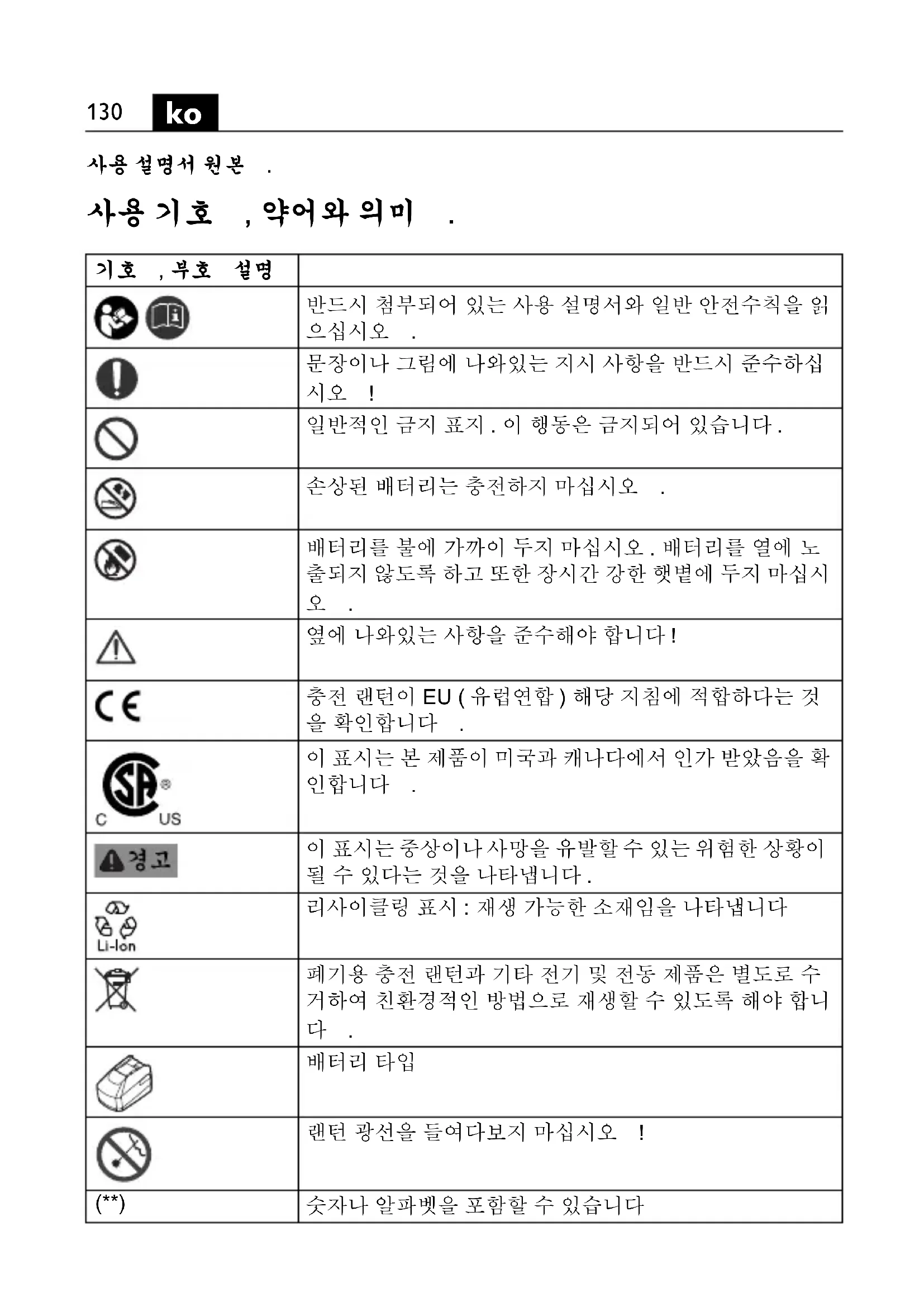 모든 안전 수칙과 지시 사항을 상세히 읽고 준수해야 합니다 . 안전 수칙 과 지시 사항을 지키지 않으면 화재 위험이 있으며 감전 혹은 중상을 입 추후 참고용으로 모든 안전 수칙과 지시 사항을 잘 보관하십시오 . 이 충전 랜턴은 본 사용 설명서를 자세히 읽고 완전히 이해한 후에 사용하십 시오 . 나중에 사용할 경우를 위해 위의 자료를 잘 보관하고 충전 랜턴을 인 도하거나 매각할 경우 설명서도 함께 전달하십시오 . 또한 국내의 해당 작업 안전 규정을 준수하십시오 . 충전 랜턴의 사용 분야 : 본 휴대용 충전 랜턴은 날씨와 관계 없는 환경에서 , 일시적이며 한정된 공간의 조 명에 사용할 수 있습니다 . 충전 랜턴용 안전 수칙 . 충전 랜턴을 가지고 폭발 위험이 있는 환경에서 작업하지 마십시오 . 충전 랜턴의 빛이 사람이나 동물에 향하지 않도록 하십시오 . 광선을 직접 들여다 보지 마십시오 . 눈이 다칠 위험이 있습니다 . 충전 랜턴이 켜져 있는 동안 랜턴 헤드를 덮지 마십시오 . 랜턴이 켜져 있으면 랜턴 헤드가 뜨거워져 타는 경우가 생길 수 있습니다 . 충전 랜턴에 명판이나 표지판을 부착하기 위해 리벳이나 나사를 사용하지 마십시 오 . 절연이 손상되면 감전 보호 효과가 무효화되므로 접착식 라벨을 사용하는 것이 좋습니다오 .부호 국제 단위 국내 단위 설명U VV정격 전압