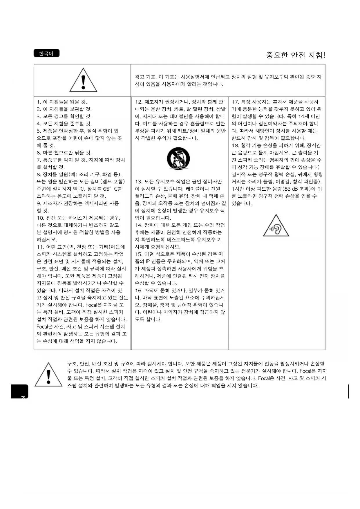 스피커 시스템을 설치하고 고정하는 작업 은 관련 표면 및 지지물에 적용되는 설치, 구조, 안전, 배선 조건 및 규격에 따라 실시 해야 합니다. 또한 제품은 제품이 고정된 지지물에 진동을 발생시키거나 손상할 수 있습니다. 따라서 설치 작업은 자격이 있 고 설치 및 안전 규격을 숙지하고 있는 전문 가가 실시해야 합니다. Focal은 지지물 또 는 특정 설비, 고객이 직접 실시한 스피커 설치 작업과 관련된 보증을 하지 않습니다. Focal은 사건, 사고 및 스피커 시스템 설치 와 관련하여 발생하는 모든 유형의 결과 또 는 손상에 대해 책임을 지지 않습니다.