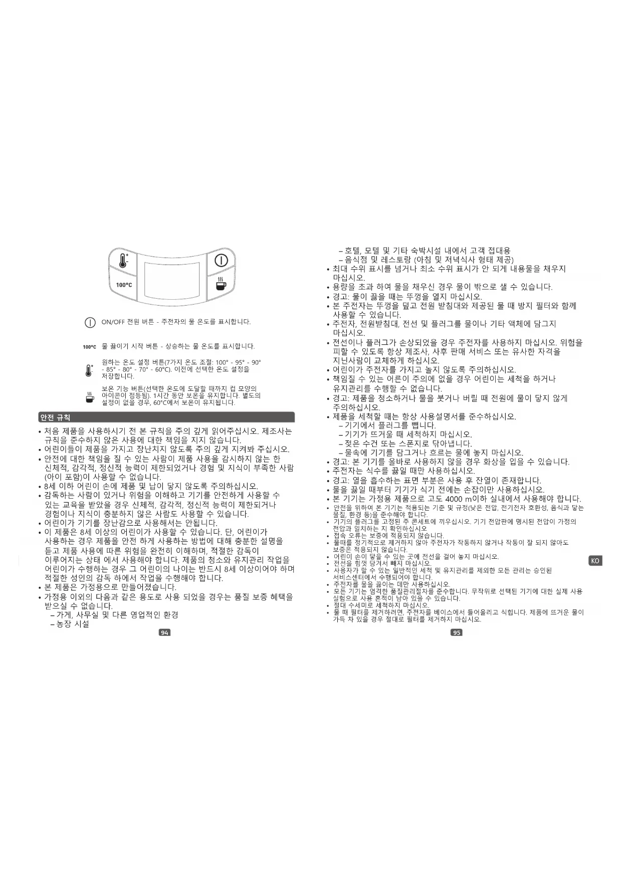 ‘보온’ 기능이 있습니다. 온도계 버튼을 눌러 원하는 온도를 설정 하고 다시 보온 버튼을 누르면 물은 설정된 온도로 데워진 후 약 1시간 동안 이 온도에서 보온으로 유지 됩니다. 물이 식을 경우 재 가열이 될 수 있습니다. 사전에 원하는 온도를 설정한 경우, 물은 설정된 온도로 데워진 후 1시간 동안 이 온도에서 보온으로 유지됩니다. 온도를 설정하지 않은 경우에는 60°C에서 보온이 유지됩니다. 보온 기능을 사용할 수 있는 최대 온도는 95°C입니다. 보온 중 주전자를 전원받침대에서 분리 하면 삐 알림음이 있고 표시창도 -- 로 표시 됩니다. 주전자를 다시 전원받침대에 장착하면 삐 소음이 있고 표시창에 온도가 표시 됩니다.