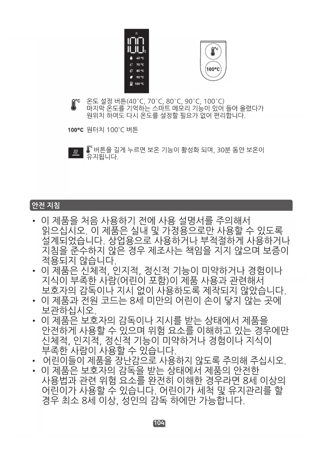 온도 설정 버튼(40°C, 70°C, 80°C, 90°C, 100°C) 마지막 온도를 기억하는 스마트 메모리 기능이 있어 들어 올렸다가 원위치 하여도 다시 온도를 설정할 필요가 없어 편리합니다. 원터치 100˚C 버튼 버튼을 길게 누르면 보온 기능이 활성화 되며, 30분 동안 보온이 유지됩니다.105