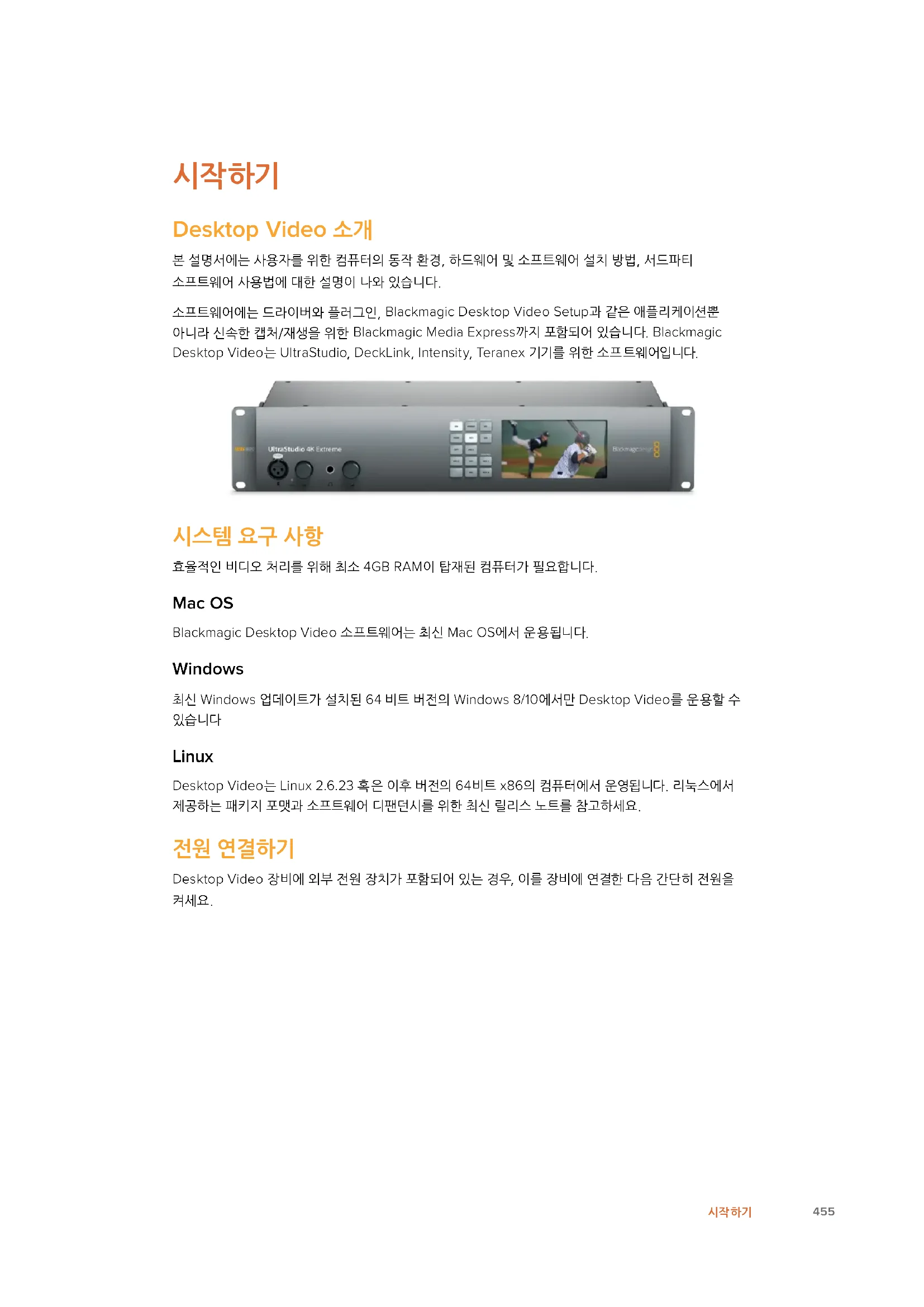 본 설명서에는 사용자를 위한 컴퓨터의 동작 환경, 하드웨어 및 소프트웨어 설치 방법, 서드파티 소프트웨어 사용법에 대한 설명이 나와 있습니다.소프트웨어에는 드라이버와 플러그인, Blackmagic Desktop Video Setup과 같은 애플리케이션뿐 아니라 신속한 캡처/재생을 위한 Blackmagic Media Express까지 포함되어 있습니다. Blackmagic Desktop Video는 UltraStudio, DeckLink, Intensity, Teranex 기기를 위한 소프트웨어입니다.