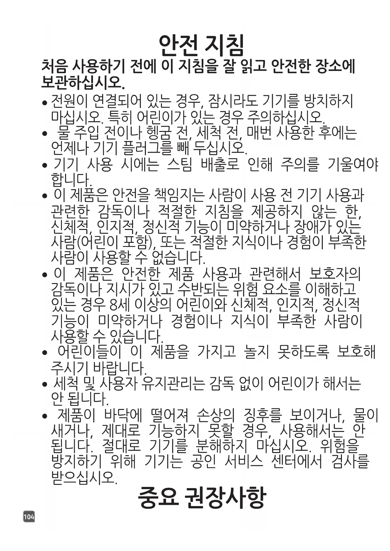 - 뜨거운 부품, 뜨거운 물 또는 스팀에 닿아 화상을 입을 수 있습니다. 스팀 제품을106 비울 때에는 주의를 기울여야 하고, 물 탱크 안, 또는 기기 내부에 뜨거운 물이 있으니 주의해 주십시오.