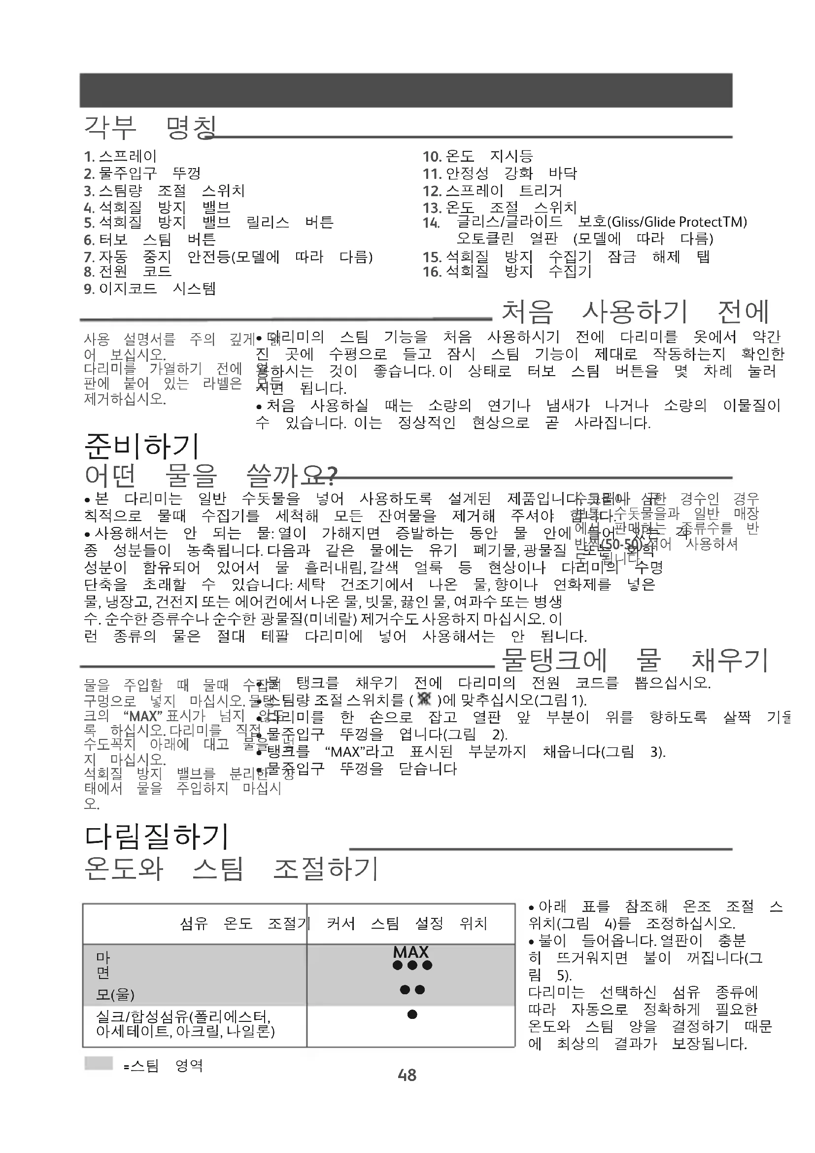 1. 스프레이2. 물주입구 뚜껑3. 스팀량 조절 스위치4. 석회질 방지 밸브5. 석회질 방지 밸브 릴리스 버튼6. 터보 스팀 버튼7. 자동 중지 안전등(모델에 따라 다름)8. 전원 코드9. 이지코드 시스템10. 온도 지시등11. 안정성 강화 바닥12. 스프레이 트리거13. 온도 조절 스위치 글리스/글라이드 보호(Gliss/Glide ProtectTM)오토클린 열판 (모델에 따라 다름)15. 석회질 방지 수집기 잠금 해제 탭16. 석회질 방지 수집기