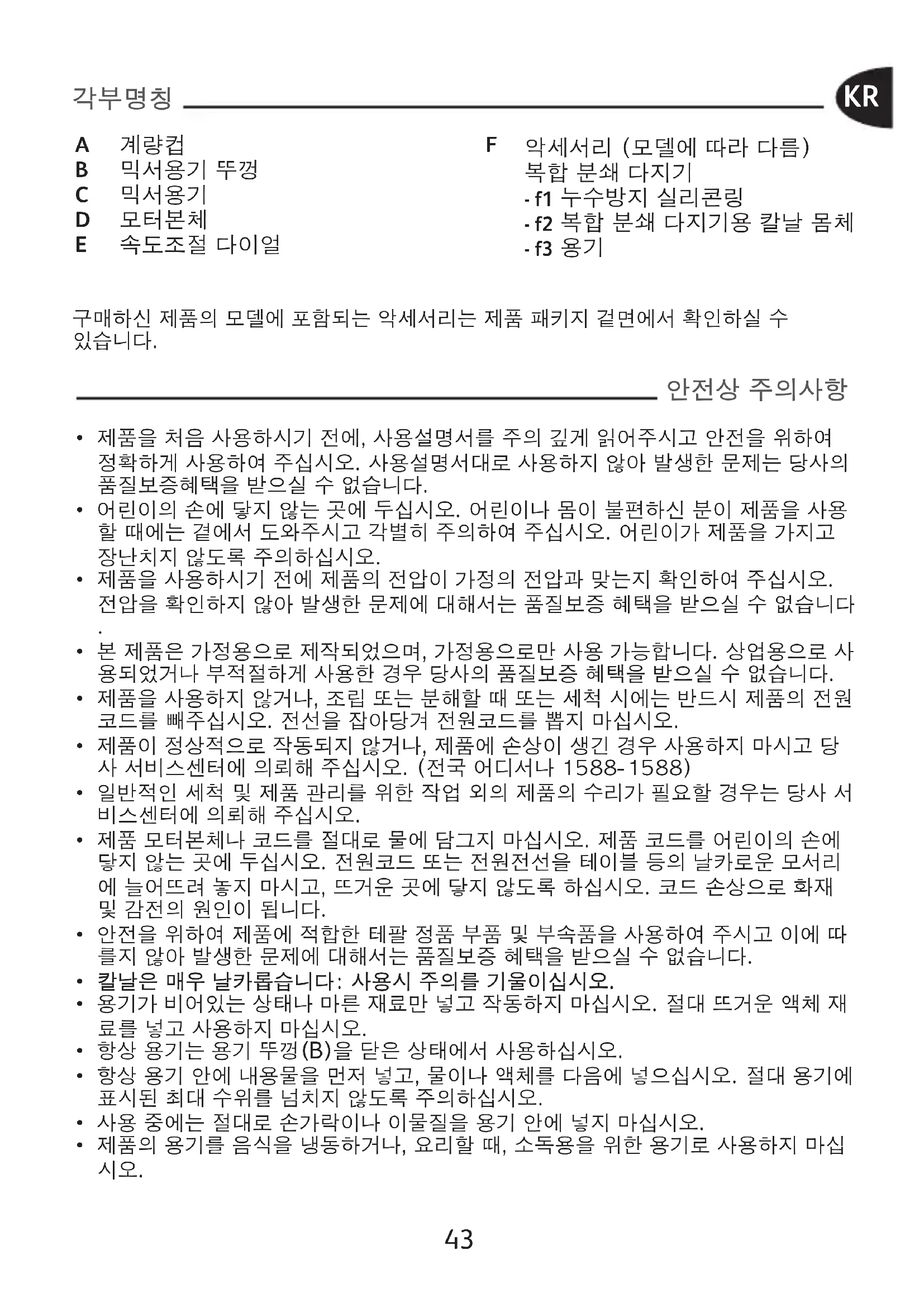 확하게 끼워 잠그십시오.칼날이 원활하게 작동하지않습니다.재료가 너무 크거나 너무 단단합 재료의 크기 또는 양을 줄이십시오. 액체를 첨가하십시오. 제품이 작동하지 않을 때는? 제품이 계속 작동하지 않을 경우 당사 서비스센터에 의뢰하십시오. 다음의 악세서리는 당사 서비스센터에서 구입할 수 있습니다: 분쇄기 악세서리 (F)