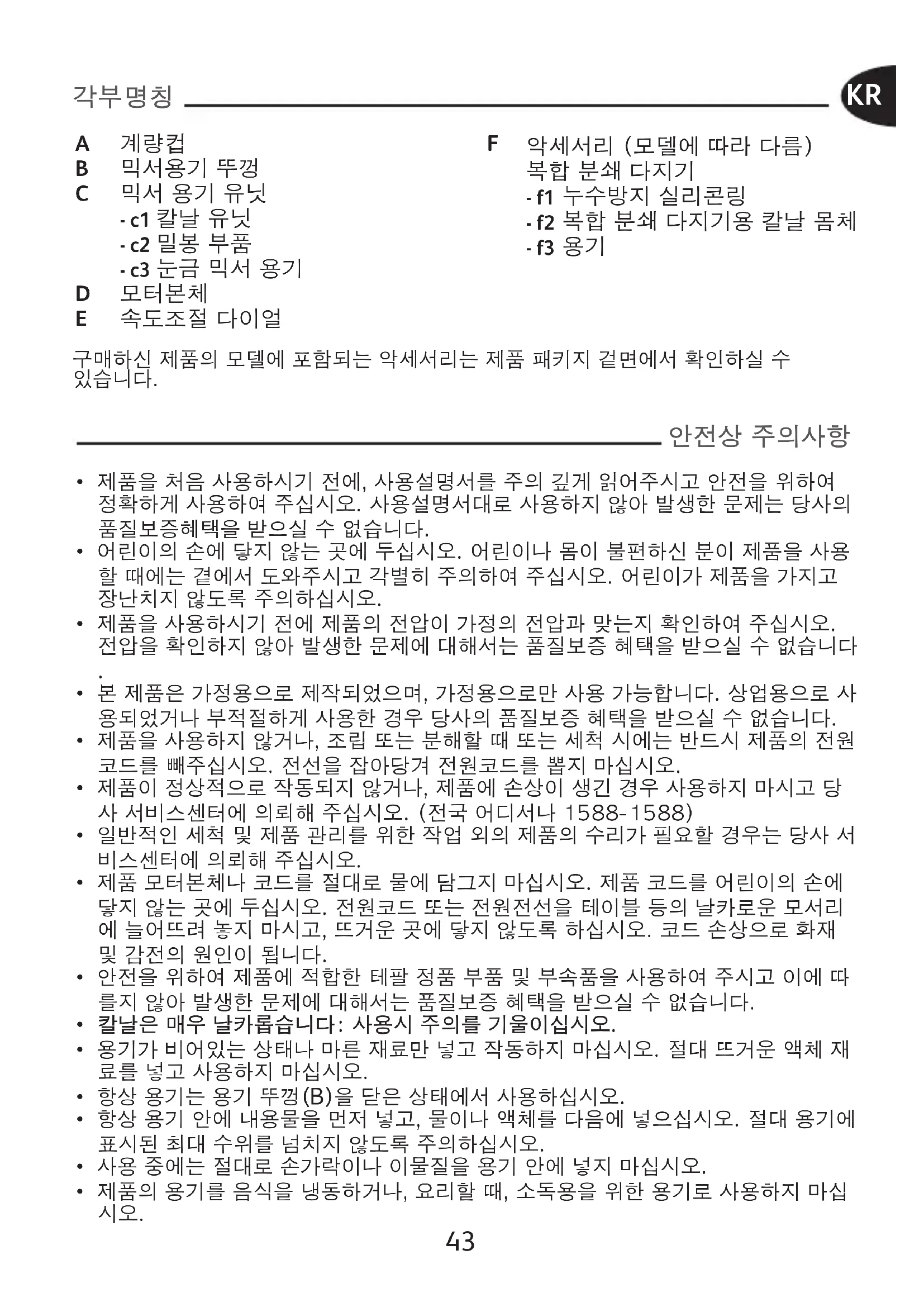 정시킵니다.칼날이 원활하게 작동하지않습니다.재료가 너무 크거나 너무 단단합 재료의 크기 또는 양을 줄이십시오. 액체를 첨가하십시오. 제품이 작동하지 않을 때는? 제품이 계속 작동하지 않을 경우 당사 서비스센터에 의뢰하십시오. 다음의 악세서리는 당사 서비스센터에서 구입할 수 있습니다: 분쇄기 악세서리 (F)