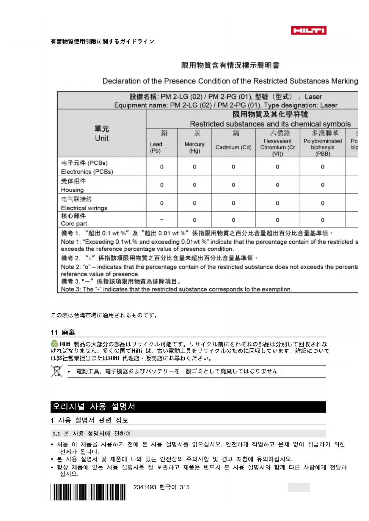 펜듈럼이 잠김 ▶ 펜듈럼의 잠금을 푸십시오. 9 제조회사 보증 ▶ 보증 조건에 관한 질문사항은 현지 Hilti 파트너사에 문의하십시오. 10 기타 정보 액세서리, 시스템 제품 및 제품 관련 세부 정보는 여기에서 확인할 수 있습니다.324 한국어 2341493 *2341493* 유해물질 사용 제한 지침 본 도표는 중국 시장에 적용됩니다.*2341493* 2341493 繁體中文 325 유해물질 사용 제한 지침 본 도표는 대만 시장에 적용됩니다. 11 폐기 Hilti 기기는 대부분 재사용이 가능한 소재로 제작되었습니다. 재활용을 위해 개별 부품을 분리하여 주십시 오. Hilti는 대부분의 국가에서 재활용을 위해 노후기기를 수거해 갑니다. Hilti 고객 서비스센터 또는 판매 상담 자에게 문의하십시오. ▶ 전동 공구, 전자식 기기 및 배터리를 일반 가정 쓰레기로 폐기하지 마십시오!