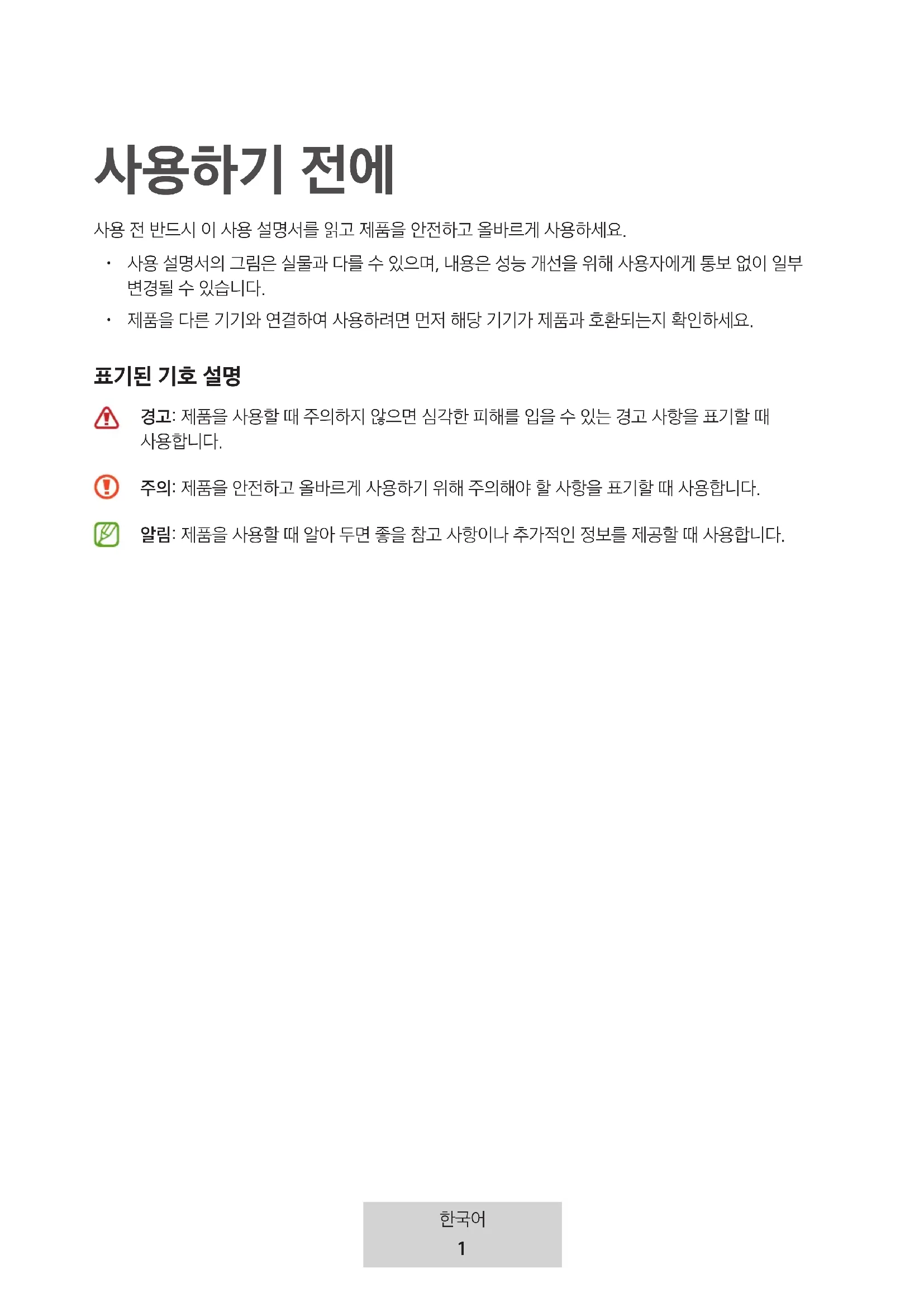 주의: 제품을 안전하고 올바르게 사용하기 위해 주의해야 할 사항을 표기할 때 사용합니다. 알림: 제품을 사용할 때 알아 두면 좋을 참고 사항이나 추가적인 정보를 제공할 때 사용합니다.2