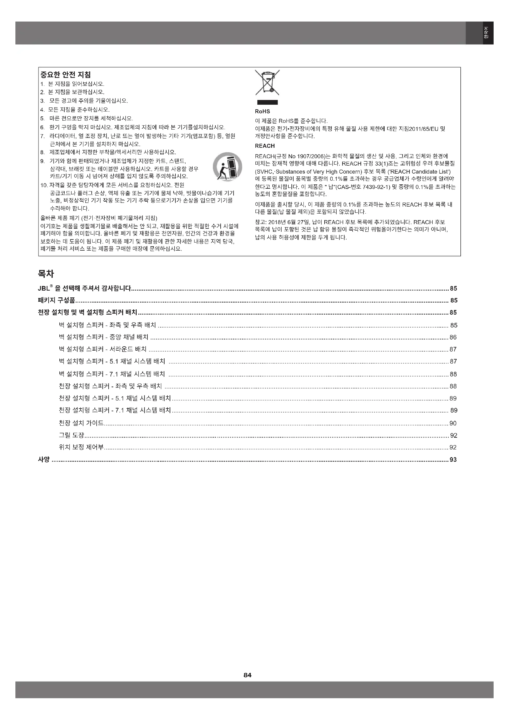 경고: HARMAN International은 라우드 스피커를 잘못 설치하거나 떨어뜨려 발생하는 개인 상해나 제품 손상 또는 부적절한 하드웨어 설치에 대해서 어떠한 책임도 지지 않습니다.