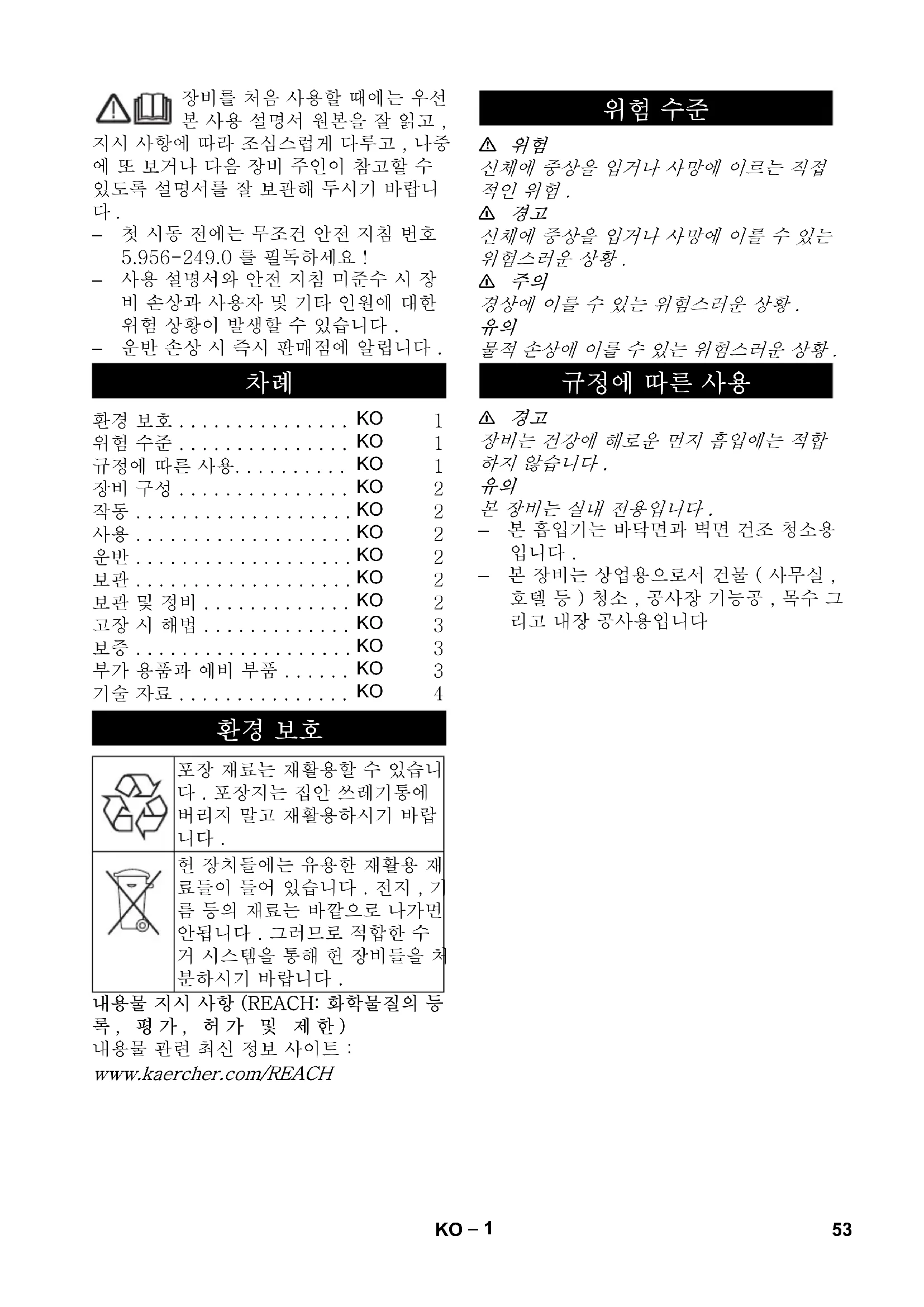 – 첫 시동 전에는 무조건 안전 지침 번호 5.956-249.0 를 필독하세요 ! – 사용 설명서와 안전 지침 미준수 시 장 비 손상과 사용자 및 기타 인원에 대한 위험 상황이 발생할 수 있습니다 . – 운반 손상 시 즉시 판매점에 알립니다 . 내용물 지시 사항 (REACH: 화학물질의 등 록, 평가, 허가 및 제한) 내용물 관련 최신 정보 사이트 : www.kaercher.com/REACH