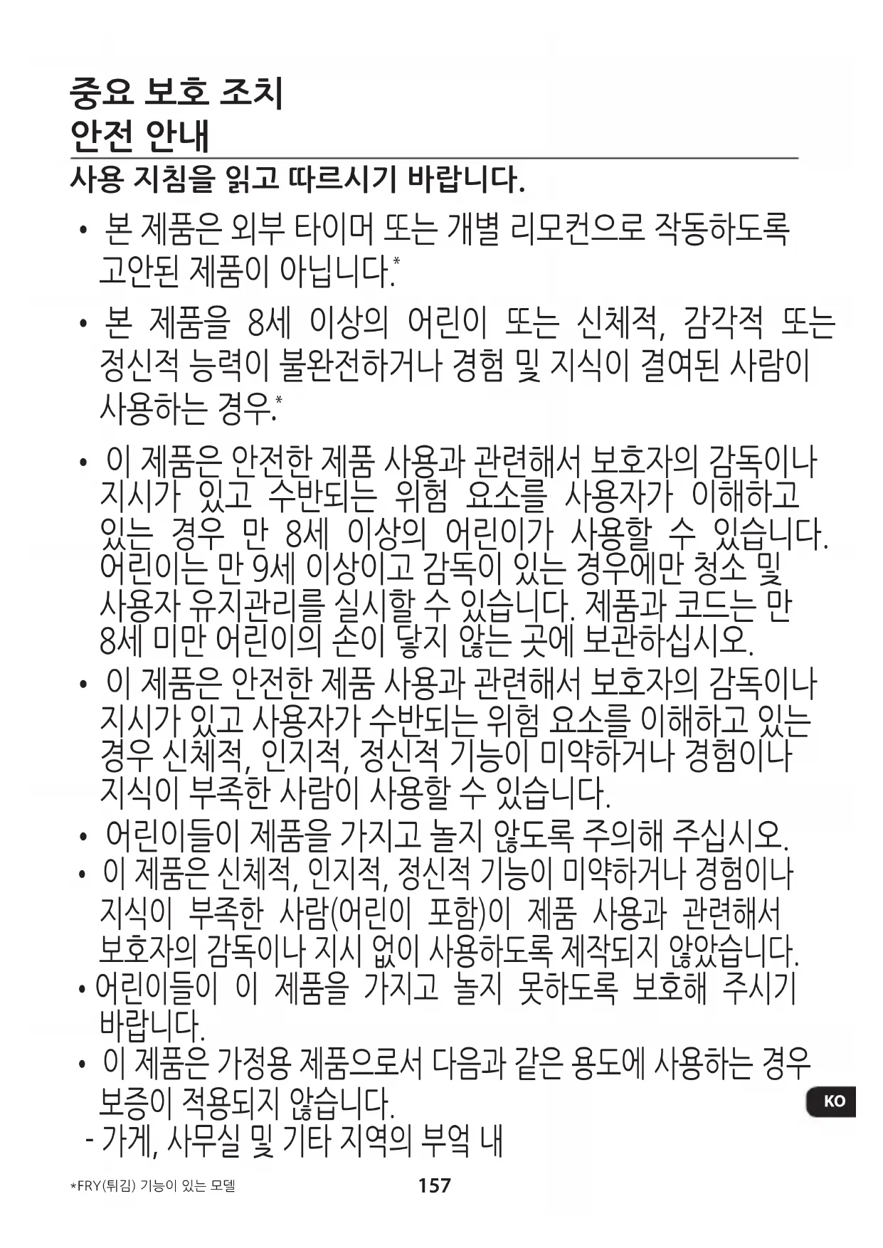 - 이 제품은 가정용 제품으로서 다음과 같은 용도에 사용하는 경우 보증이 적용되지 않습니다. - 가게, 사무실 및 기타 지역의 부엌 내 *FRY(튀김) 기능이 있는 모델158
