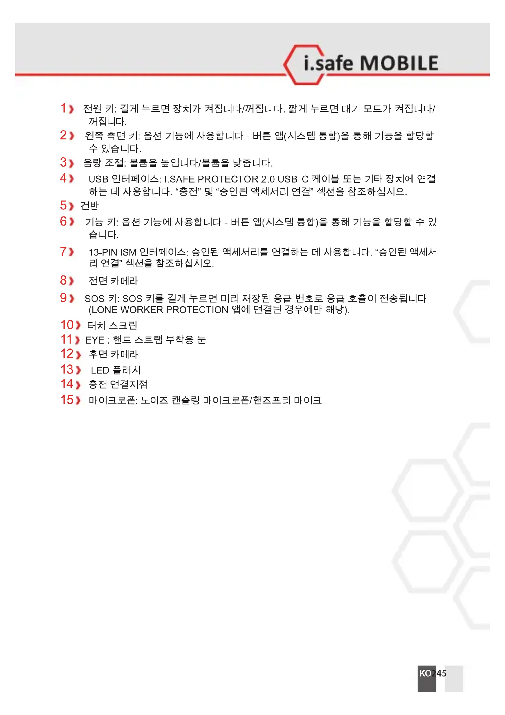 본 장치를 반드시 사용 설명서에 나온 대로 사용하십시오. 그 외의 사용은 부적절한 것으로 간주되고 사망, 중상 및 장치 파손을 일으킬 수 있습니다. 제조사 i.safe MOBILE GmbH는 부적절한 사용으로 인한 피해에 대해 배상 책임을 지지 않 습니다. 부적절하게 사용하는 경우 보증이 무효가 됩니다.KO 243