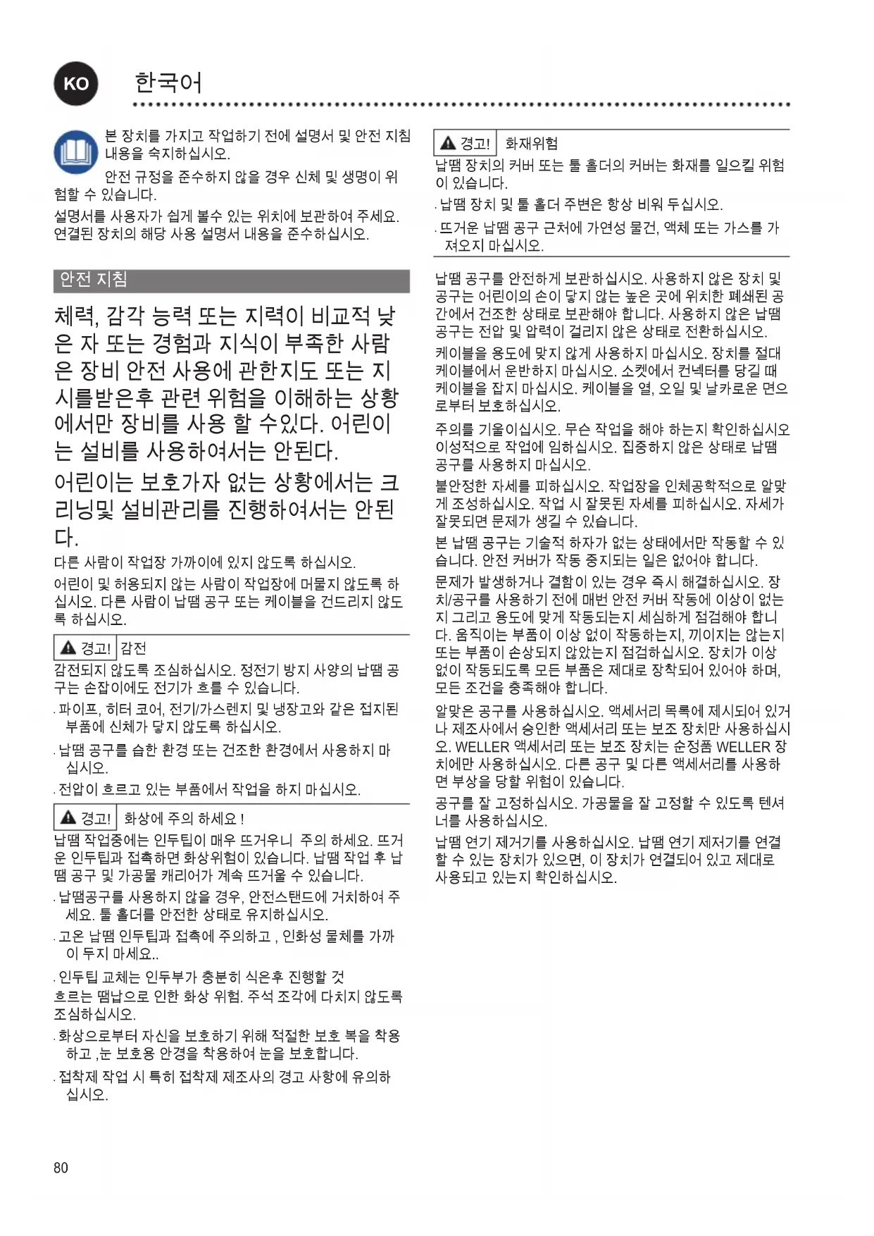 납땜 공구를 안전하게 보관하십시오. 사용하지 않은 장치 및 공구는 어린이의 손이 닿지 않는 높은 곳에 위치한 폐쇄된 공 간에서 건조한 상태로 보관해야 합니다. 사용하지 않은 납땜 공구는 전압 및 압력이 걸리지 않은 상태로 전환하십시오. 케이블을 용도에 맞지 않게 사용하지 마십시오. 장치를 절대 케이블에서 운반하지 마십시오. 소켓에서 컨넥터를 당길 때 케이블을 잡지 마십시오. 케이블을 열, 오일 및 날카로운 면으 로부터 보호하십시오. 주의를 기울이십시오. 무슨 작업을 해야 하는지 확인하십시오 이성적으로 작업에 임하십시오. 집중하지 않은 상태로 납땜 공구를 사용하지 마십시오. 불안정한 자세를 피하십시오. 작업장을 인체공학적으로 알맞 게 조성하십시오. 작업 시 잘못된 자세를 피하십시오. 자세가 잘못되면 문제가 생길 수 있습니다. 본 납땜 공구는 기술적 하자가 없는 상태에서만 작동할 수 있 습니다. 안전 커버가 작동 중지되는 일은 없어야 합니다. 문제가 발생하거나 결함이 있는 경우 즉시 해결하십시오. 장 치/공구를 사용하기 전에 매번 안전 커버 작동에 이상이 없는 지 그리고 용도에 맞게 작동되는지 세심하게 점검해야 합니 다. 움직이는 부품이 이상 없이 작동하는지, 끼이지는 않는지 또는 부품이 손상되지 않았는지 점검하십시오. 장치가 이상 없이 작동되도록 모든 부품은 제대로 장착되어 있어야 하며, 모든 조건을 충족해야 합니다. 알맞은 공구를 사용하십시오. 액세서리 목록에 제시되어 있거 나 제조사에서 승인한 액세서리 또는 보조 장치만 사용하십시 오. WELLER 액세서리 또는 보조 장치는 순정품 WELLER 장 치에만 사용하십시오. 다른 공구 및 다른 액세서리를 사용하 면 부상을 당할 위험이 있습니다. 공구를 잘 고정하십시오. 가공물을 잘 고정할 수 있도록 텐셔