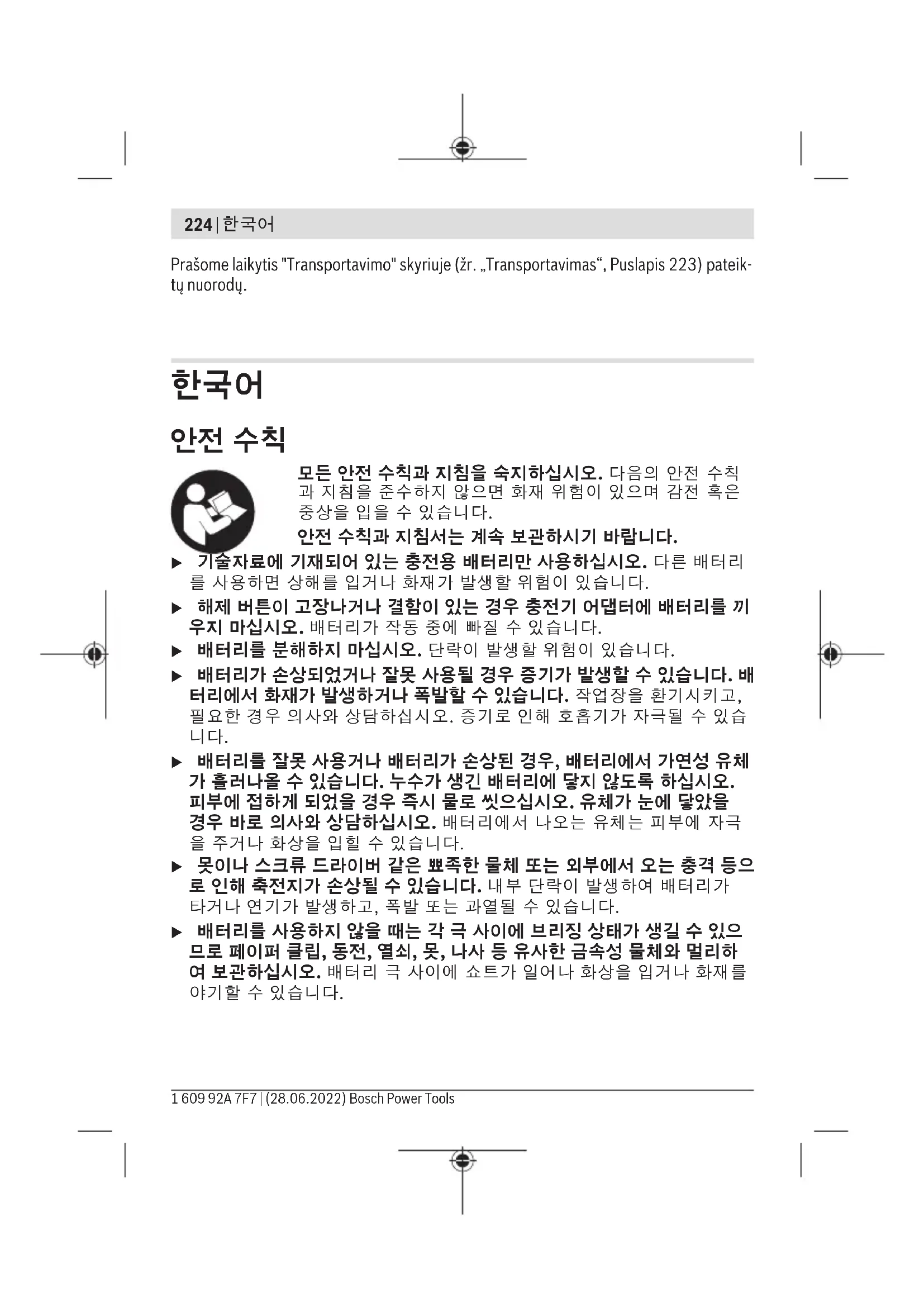u 배터리를 잘못 사용거나 배터리가 손상된 경우, 배터리에서 가연성 유체 가 흘러나올 수 있습니다. 누수가 생긴 배터리에 닿지 않도록 하십시오. 피부에 접하게 되었을 경우 즉시 물로 씻으십시오. 유체가 눈에 닿았을 경우 바로 의사와 상담하십시오. 배터리에서 나오는 유체는 피부에 자극 을 주거나 화상을 입힐 수 있습니다. u 못이나 스크류 드라이버 같은 뾰족한 물체 또는 외부에서 오는 충격 등으 로 인해 축전지가 손상될 수 있습니다. 내부 단락이 발생하여 배터리가 타거나 연기가 발생하고, 폭발 또는 과열될 수 있습니다. u 배터리를 사용하지 않을 때는 각 극 사이에 브리징 상태가 생길 수 있으 므로 페이퍼 클립, 동전, 열쇠, 못, 나사 등 유사한 금속성 물체와 멀리하 여 보관하십시오. 배터리 극 사이에 쇼트가 일어나 화상을 입거나 화재를 야기할 수 있습니다. 1 609 92A 7F7 | (28.06.2022) Bosch Power Tools한국어 | 225 배터리를 태양 광선 등 고열에 장시간 노출되지 않도록 하 고 불과 오염물질, 물, 수분이 있는 곳에 두지 마십시오. 폭 발 및 단락의 위험이 있습니다.