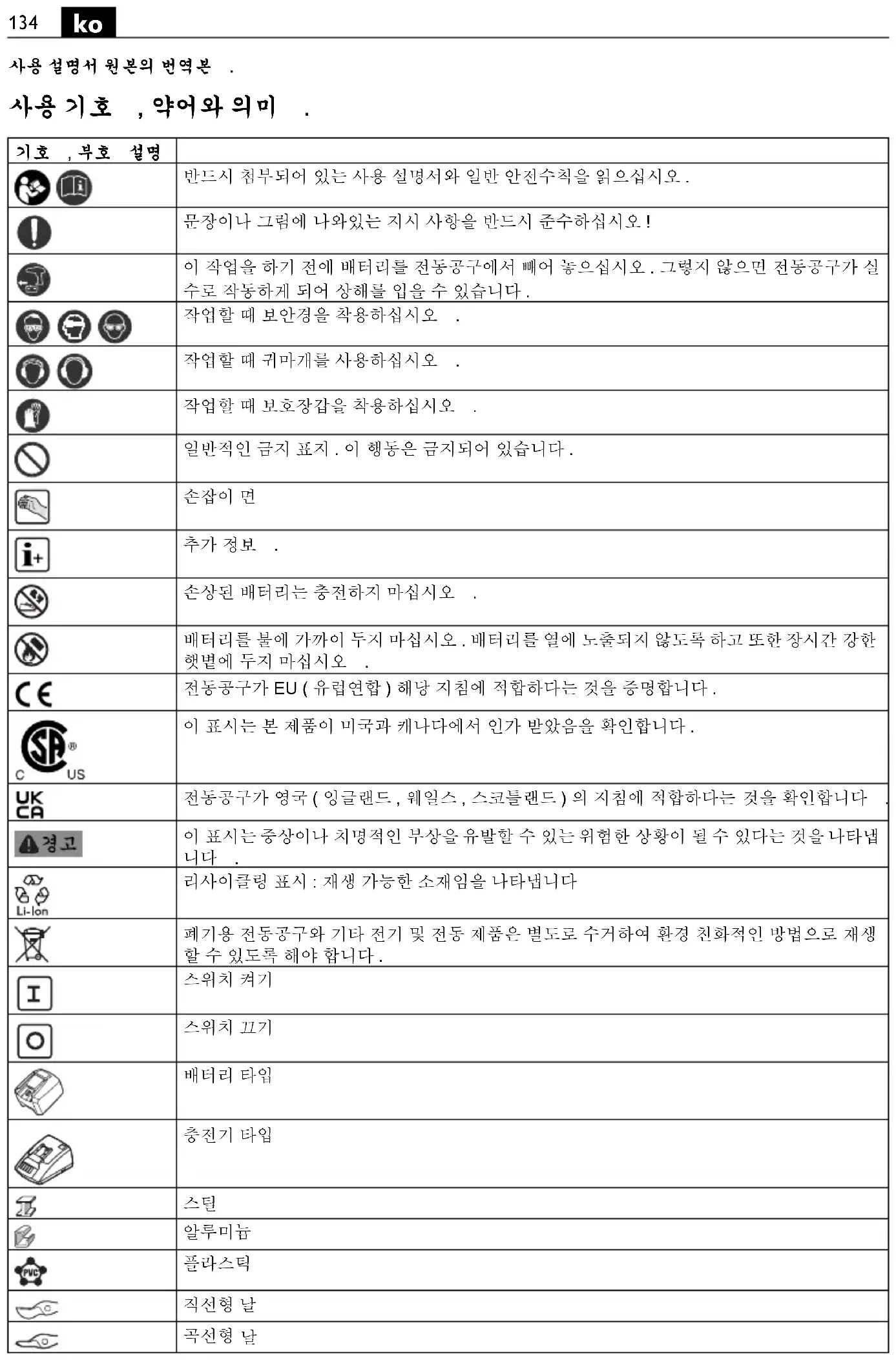 이해한 후에 기기를 사용하십시오. 나중에 사용할 경우를 위해 위의 자료를 잘 보관하고 전동공구를 인도하 거나 매각할 경우 설명서도 함께 전달하십시오 . 또한 국내의 해당 작업 안전 규정을 준수하십시오 .
