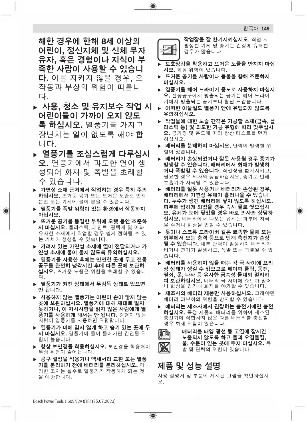 모든 안전 수칙과 지침을 숙지하십시오. 다음의 안전 수칙과 지침을 준수하지 않 으면 화재 위험이 있으며 감전 혹은 중 상을 입을 수 있습니다. 안전 수칙과 지침서는 계속 보관하시기 바랍니다. u 본 열풍기는 어린이나 정신지 체 및 신체 부자유자 혹은 경험 이나 지식이 부족한 사람이 사 용하기에 적합하지 않습니다. 본 열풍기는 안전 책임자의 감 독 하에 혹은 감독자에게 열풍 기의 안전한 사용법과 관련 위 험사항에 대한 교육을 받고 이 1 609 92A 8YR | (25.07.2023) Bosch Power Tools한국어 | 149 해한 경우에 한해 8세 이상의 어린이, 정신지체 및 신체 부자 유자, 혹은 경험이나 지식이 부 족한 사람이 사용할 수 있습니 다. 이를 지키지 않을 경우, 오 작동과 부상의 위험이 따릅니