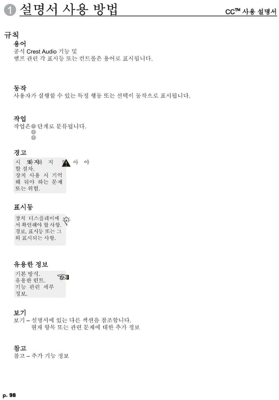120VAC / 60 Hz 또는 240VAC / 50 Hz 포장을 바꿀 경우 Crest Audio 고객 서비스팀에 문의하시기 바랍니다.보기 – 서비스 및 지원오디를 연결하기 전에 앰프는 항상 꺼두고 메인 전압에서 분리해 두십시오. 또한 전원이 공급되는 동안에는 감쇠기를 줄이십시오. p. 100p. 5