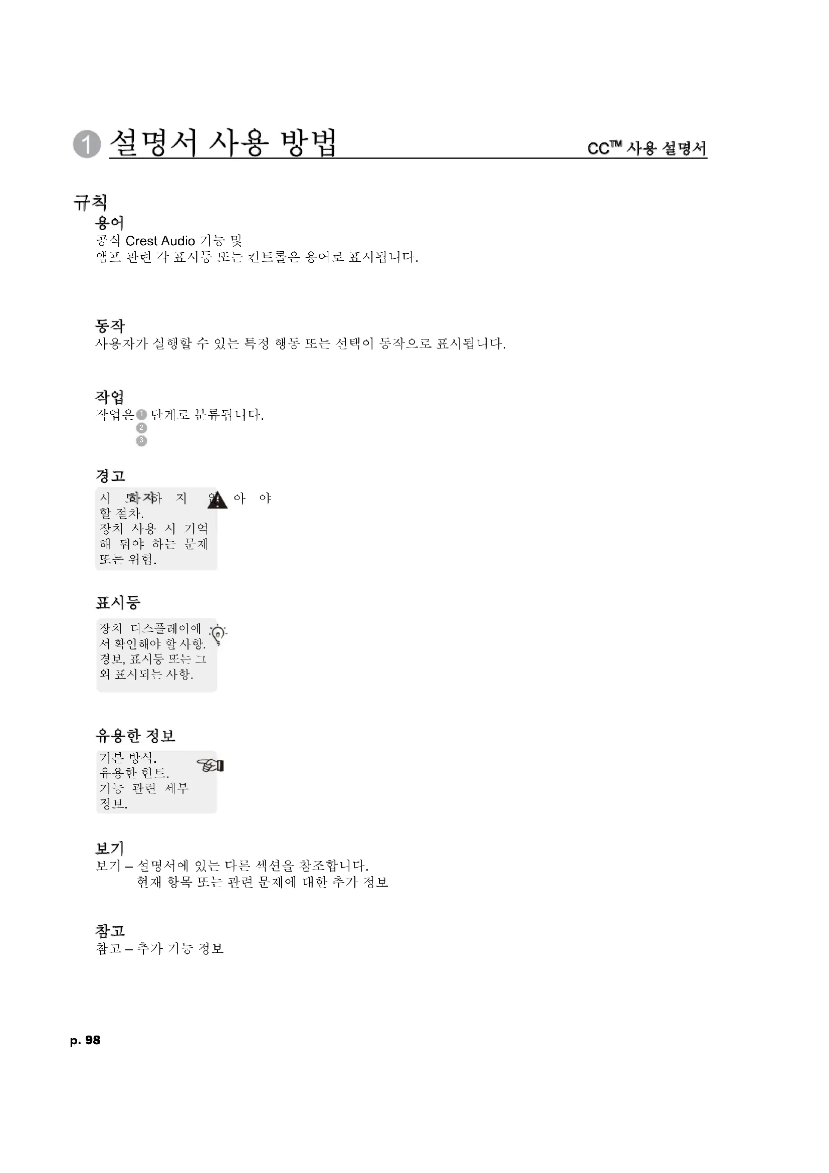 이메일: techserve@crestaudio.com 이 기호는 사용자가 이 문서에 자 세히 기재된 중요한 절차를 엄수 해야 함을 나타내는 경보의 의미