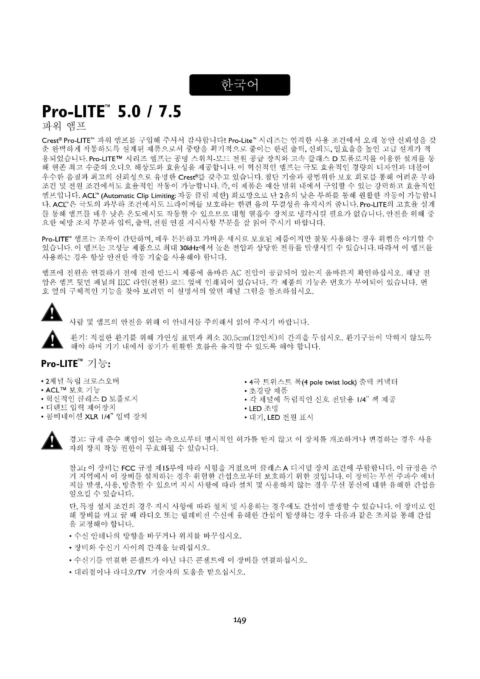 은 극도의 과부하 조건에서도 드라이버를 보호하는 한편 음의 무결성을 유지시켜 줍니다. Pro-LITE의 고효율 설계 를 통해 앰프를 매우 낮은 온도에서도 작동할 수 있으므로 대형 열흡수 장치로 냉각시킬 필요가 없습니다. 안전을 위해 중 요한 예방 조치 부분과 입력, 출력, 전원 연결 지시사항 부분을 잘 읽어 주시기 바랍니다. Pro-LITE