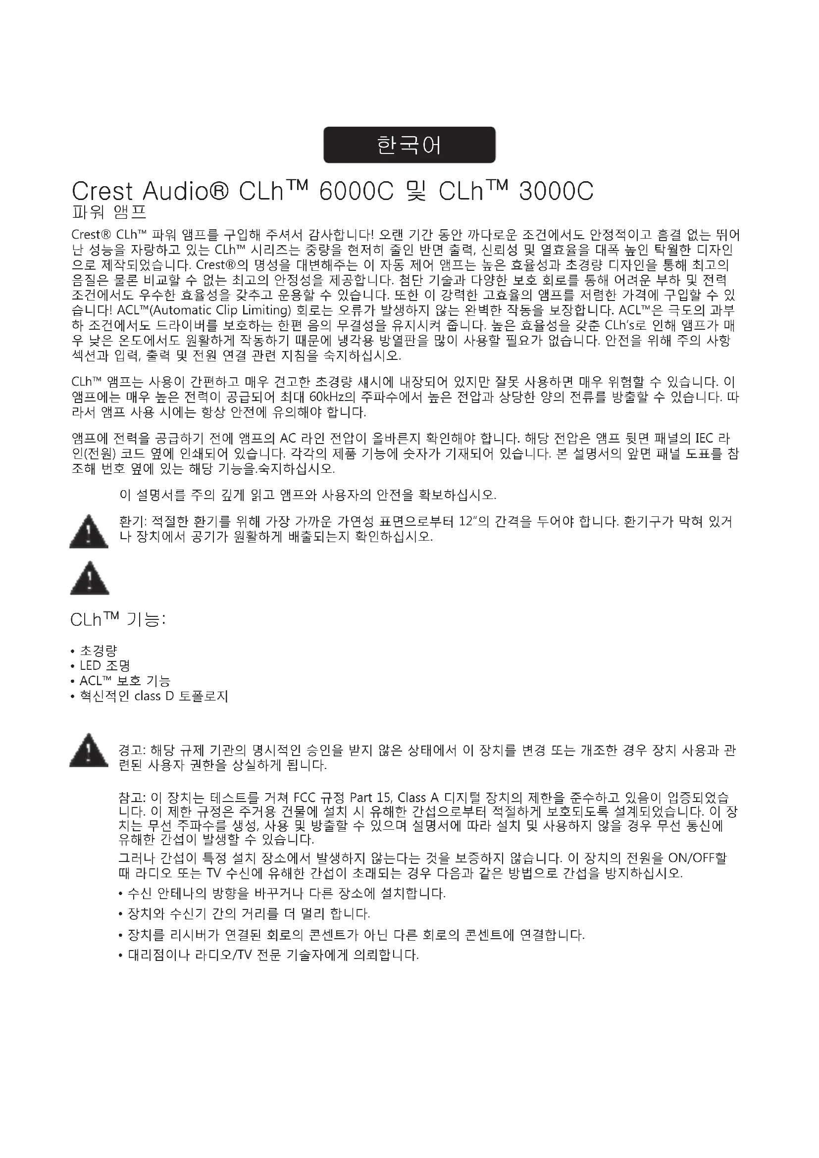 Crest® CLh™ 파워 앰프를 구입해 주셔서 감사합니다! 오랜 기간 동안 까다로운 조건에서도 안정적이고 흠결 없는 뛰어 난 성능을 자랑하고 있는 CLh™ 시리즈는 중량을 현저히 줄인 반면 출력, 신뢰성 및 열효율을 대폭 높인 탁월한 디자인 으로 제작되었습니다. Crest®의 명성을 대변해주는 이 자동 제어 앰프는 높은 효율성과 초경량 디자인을 통해 최고의 음질은 물론 비교할 수 없는 최고의 안정성을 제공합니다. 첨단 기술과 다양한 보호 회로를 통해 어려운 부하 및 전력 조건에서도 우수한 효율성을 갖추고 운용할 수 있습니다. 또한 이 강력한 고효율의 앰프를 저렴한 가격에 구입할 수 있 습니다! ACL™(Automatic Clip Limiting) 회로는 오류가 발생하지 않는 완벽한 작동을 보장합니다. ACL™은 극도의 과부 하 조건에서도 드라이버를 보호하는 한편 음의 무결성을 유지시켜 줍니다. 높은 효율성을 갖춘 CLh’s로 인해 앰프가 매 우 낮은 온도에서도 원활하게 작동하기 때문에 냉각용 방열판을 많이 사용할 필요가 없습니다. 안전을 위해 주의 사항 섹션과 입력, 출력 및 전원 연결 관련 지침을 숙지하십시오. CLh™ 앰프는 사용이 간편하고 매우 견고한 초경량 섀시에 내장되어 있지만 잘못 사용하면 매우 위험할 수 있습니다. 이 앰프에는 매우 높은 전력이 공급되어 최대 60kHz의 주파수에서 높은 전압과 상당한 양의 전류를 방출할 수 있습니다. 따 라서 앰프 사용 시에는 항상 안전에 유의해야 합니다. 앰프에 전력을 공급하기 전에 앰프의 AC 라인 전압이 올바른지 확인해야 합니다. 해당 전압은 앰프 뒷면 패널의 IEC 라 인(전원) 코드 옆에 인쇄되어 있습니다. 각각의 제품 기능에 숫자가 기재되어 있습니다. 본 설명서의 앞면 패널 도표를 참 조해 번호 옆에 있는 해당 기능을.숙지하십시오. 이 설명서를 주의 깊게 읽고 앰프와 사용자의 안전을 확보하십시오. 환기: 적절한 환기를 위해 가장 가까운 가연성 표면으로부터 12”의 간격을 두어야 합니다. 환기구가 막혀 있거 나 장치에서 공기가 원활하게 배출되는지 확인하십시오.