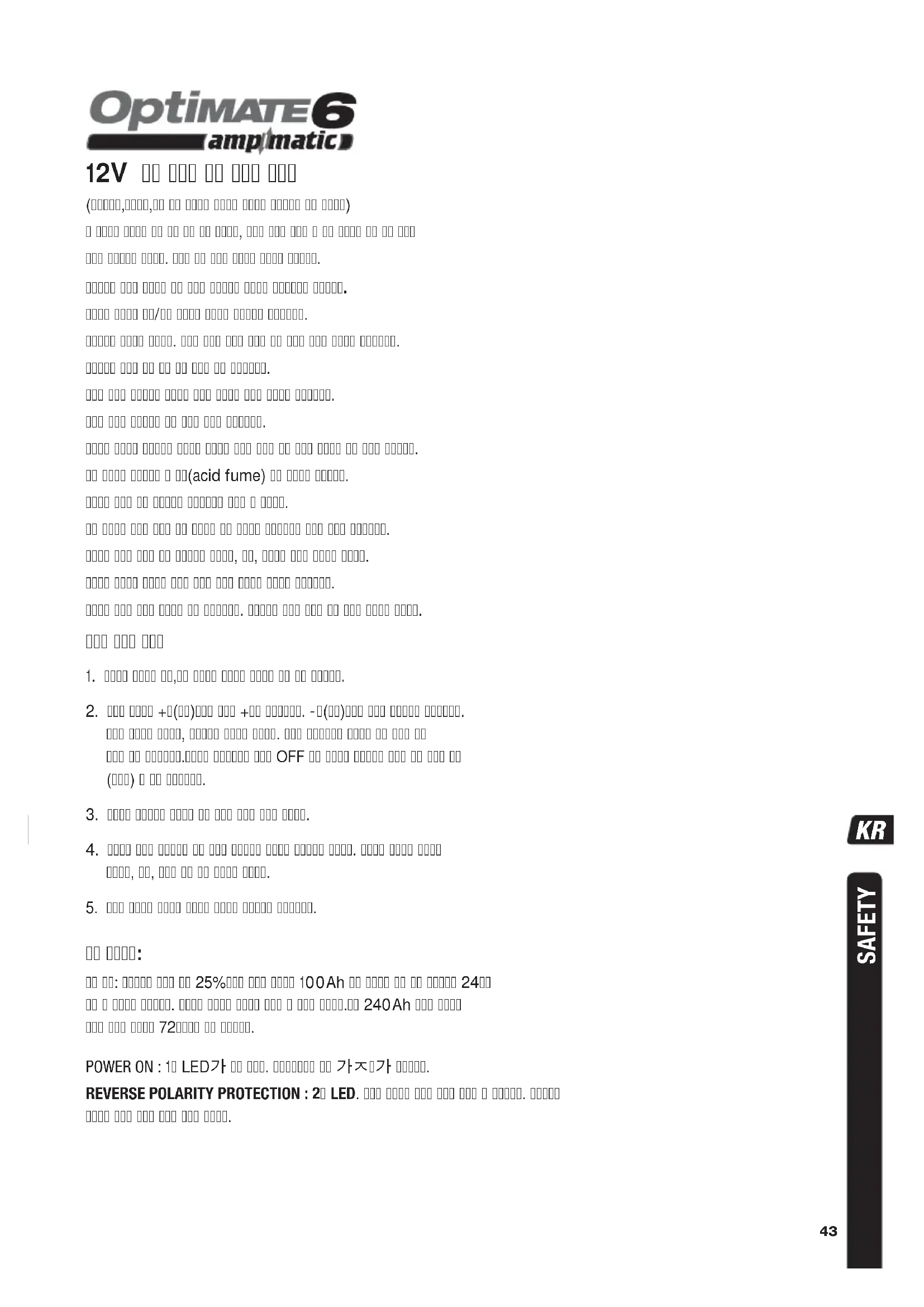 수 있습니다. 이는 12시간의 테스트에도 나타나지 않을 수 있습니다. 배터리를 옵티메이트에서 분리하고 적어도 48시간 후에 재연결하여 사전테스트 결과를 관찰합니다. 배터리 장기 유지방법: 옵티메이트는 한 번의 관리로 수개월간 배터리의 상태를 유지합니다. 적어도 2주마다 배터리의 연결상태를 점검하고 보수형 배터리의 경우 전해액 레벨을 확인하고 필요시 증류수를 보충합니다. 배터리를 사용하거나 인접한 경우에는 항 상 안전사항을 확인하시고 준수하십시오.