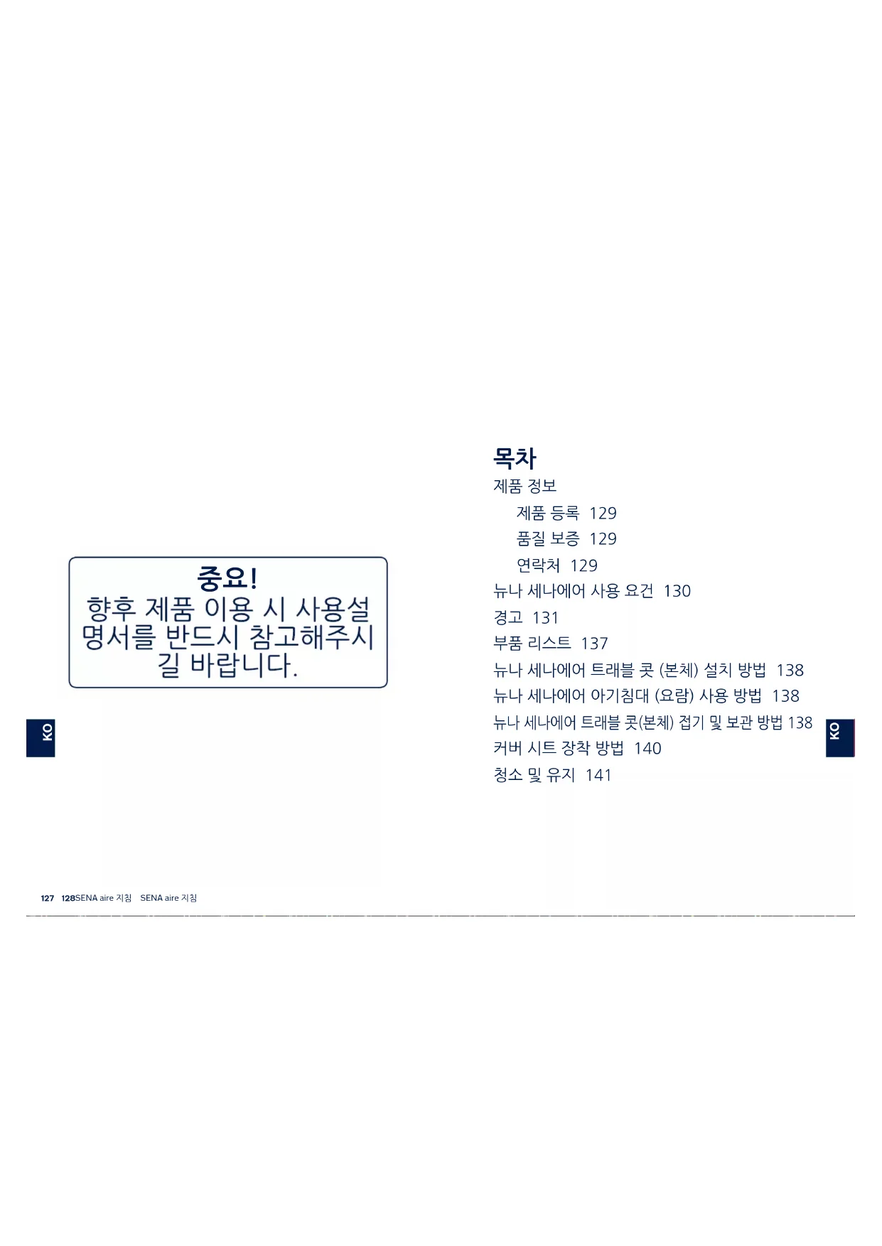 제품 등록 129 품질 보증 129 연락처 129 뉴나 세나에어 사용 요건 130 경고 131 부품 리스트 137 뉴나 세나에어 트래블 콧 (본체) 설치 방법 138 뉴나 세나에어 아기침대 (요람) 사용 방법 138 뉴나 세나에어 트래블 콧(본체) 접기 및 보관 방법 138 커버 시트 장착 방법 140 청소 및 유지 141 중요!SENA aire 지침 SENA aire 지침
