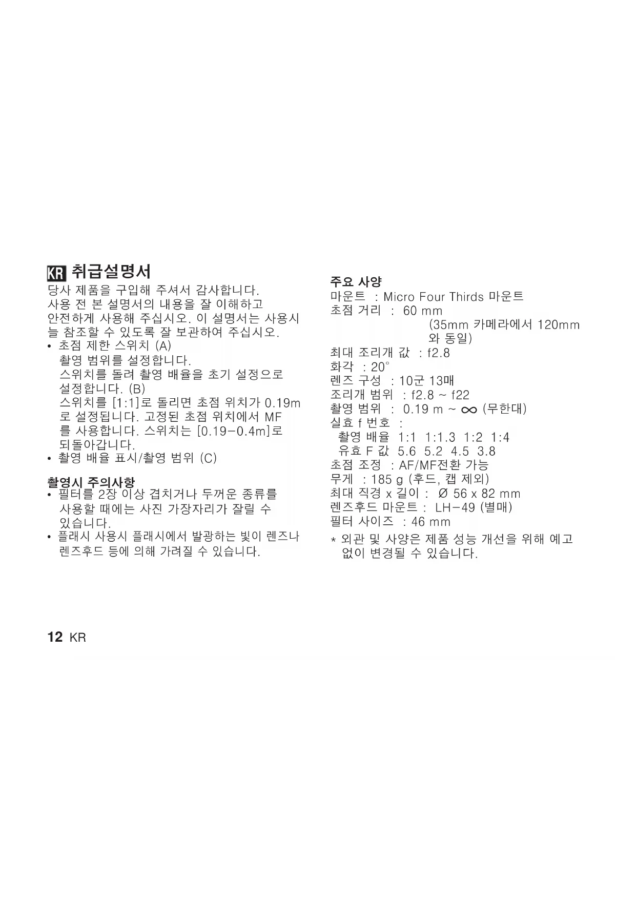 사용 설명서 ED 60mm F2.8 Macro OLYMPUS