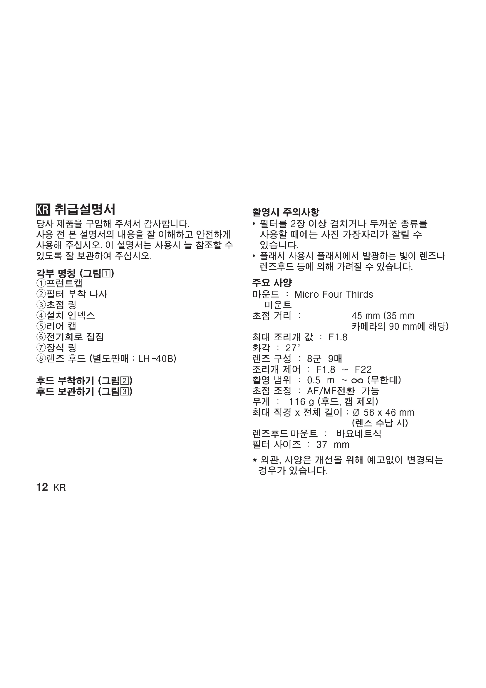 사용 설명서 ED 45mm F1.8 OLYMPUS