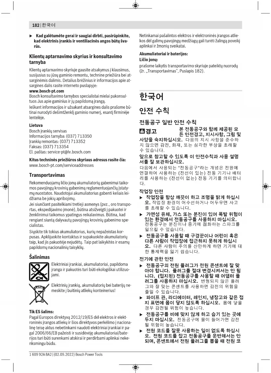 u 각 전동공구용으로 나와있는 배터리만을 사용하 십시오. 다른 종류의 배터리를 사용하면 상해를 입거나 화재를 초래할 수 있습니다. u 배터리를 사용하지 않을 때는, 각 극을 자극 할 수 있는 페이퍼 클립, 동전, 열쇠, 못, 나사 등 유사한 금속성 물체와 멀리하여 보관하십시오. 배터리 극 사이에 쇼트가 일어나 화상을 입거나 화재를 야기할 수 있습니다. u 배터리를 잘못 사용하면 누수가 생길 수 있습니 다. 누수가 생긴 배터리에 닿지 않도록 하십시오. 피부에 접촉하게 되었을 경우 즉시 물로 씻으십 시오. 유체가 눈에 닿았을 경우 바로 의사와 상담 하십시오. 배터리에서 나오는 유체는 피부에 자 극을 주거나 화상을 입힐 수 있습니다. Bosch Power Tools 1 609 92A 8A2 | (02.09.2022)184 | 한국어 u 손상된 배터리 또는 공구를 사용하지 마십시오. 손상되었거나 개조된 배터리는 예기치 못한 특성 으로 인해 화재, 폭발 또는 부상의 위험을 초래할