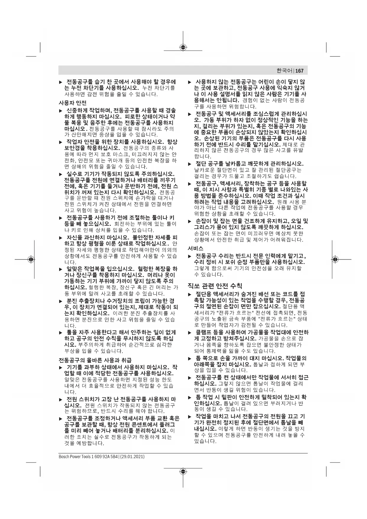 1 609 92A 5B4 | (29.01.2021) Bosch Power Tools한국어 | 167 u 전동공구를 습기 찬 곳에서 사용해야 할 경우에 는 누전 차단기를 사용하십시오. 누전 차단기를 사용하면 감전 위험을 줄일 수 있습니다.