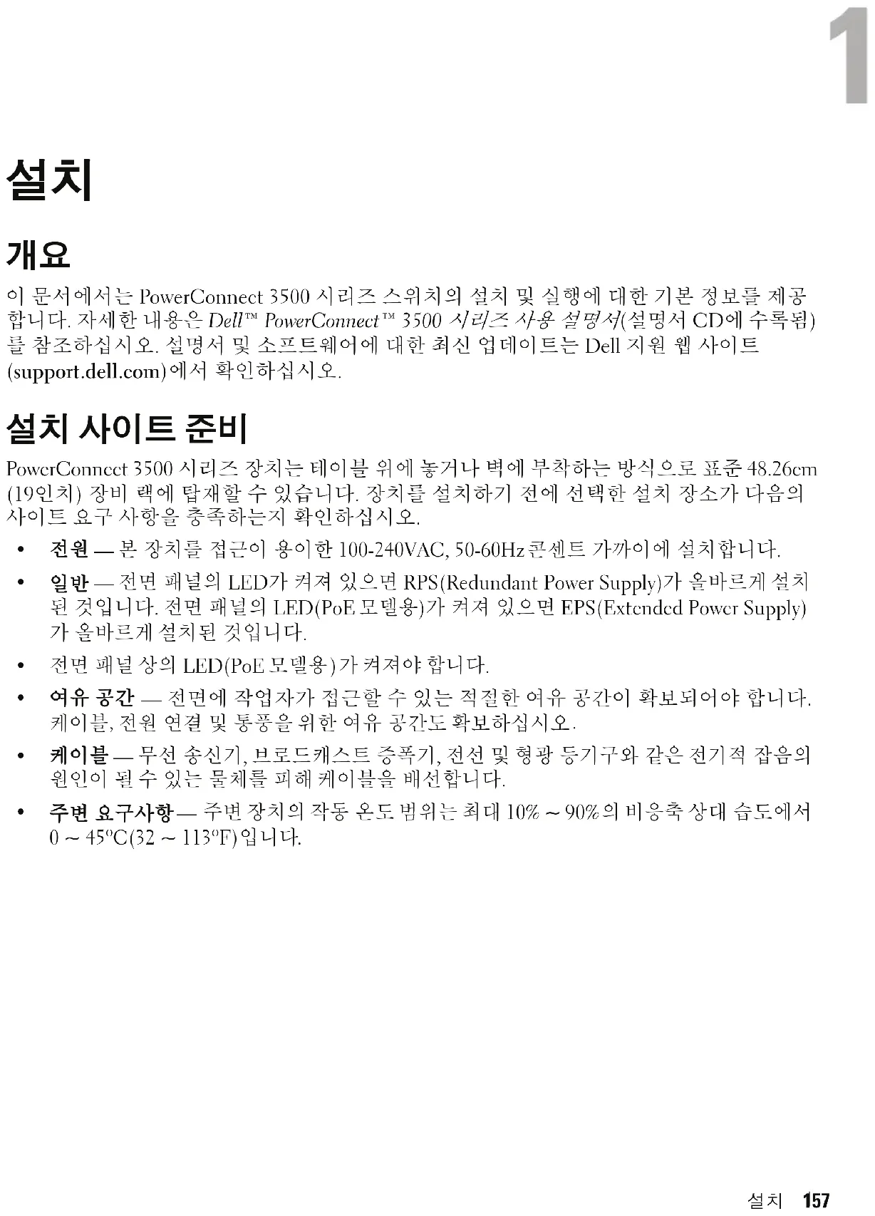PowerConnect 3500 시리즈 장치는 테이블 위에 놓거나 벽에 부착하는 방식으로 표준 48.26cm (19인치) 장비 랙에 탑재할 수 있습니다. 장치를 설치하기 전에 선택한 설치 장소가 다음의 사이트 요구 사항을 충족하는지 확인하십시오.