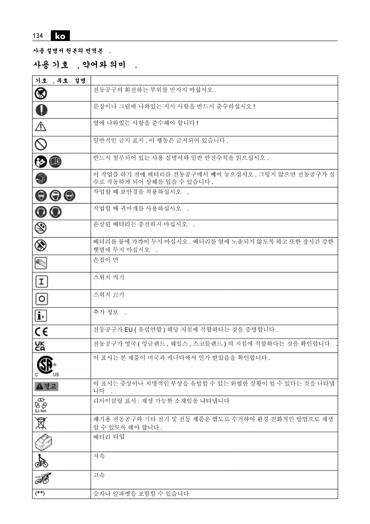 기기와 함께 공급되는 보조 손잡이를 사용하십시오 . 기기 에 대한 통제를 잃게되면 상해를 입을 수 있습니다 . 작업할 때 제품에 장착된 액세서리로 보이지 않는 전선에 접촉할 수 있으면 반드시 전동공구의 절연된 손잡이 면을 잡으십시오. 전류가 흐르는 전선에 닿게되면 기기의 금속 부위에도 전기가 통해 감전될 수 있기 때문입니다 . 보이지 않는 부위에 있는 배선 및 배관 여부를 확인하십시 오 . 작업을 시작하기 전에 금속 탐지기 등을 사용하여 작 업 분야를 점검하십시오 . 작업물을 잘 고정하십시오 . 고정장치에 장착하여 작업하 면 손으로 잡는 것보다 더 안전합니다 . 전동공구를 꽉 잡으십시오 . 갑자기 강한 반동력이 생길 전동공구를 작업자 자신이나 다른 사람 혹은 동물에 향하 게 하지 마십시오 . 날카롭거나 뜨거운 액세서리로 인해 상해를 입을 수 있습니다 .부호 국제 단위 국내 단위 설명
