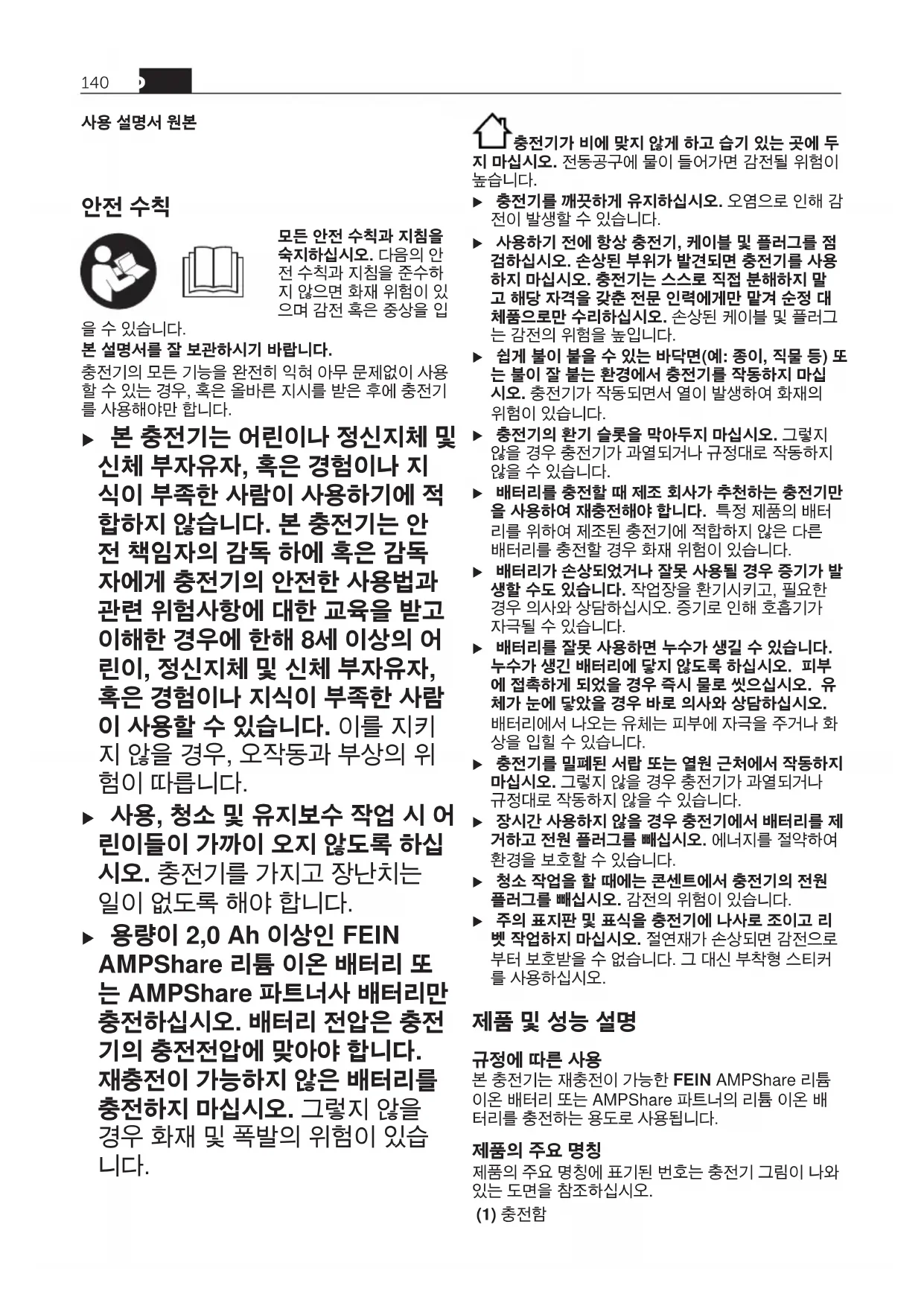 제품 및 성능 설명한국어 규정에 따른 사용한국어 본 충전기는 재충전이 가능한 FEIN AMPShare 리튬 이온 배터리 또는 AMPShare 파트너의 리튬 이온 배 터리를 충전하는 용도로 사용됩니다. 제품의 주요 명칭한국어 제품의 주요 명칭에 표기된 번호는 충전기 그림이 나와 있는 도면을 참조하십시오. (1) 충전함 140 ko 34101366060 • 1.6.22(2) 벽 거치대 (3) 배터리 충전상태 녹색 표시기 (4) Power Boost 버튼 (5) 온도 감시/오류 적색 표시기