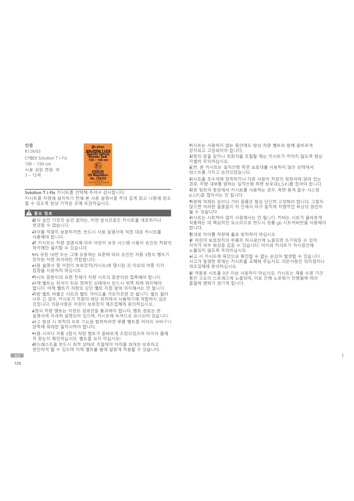 Cybex GmbHRiedingerstr. 18, 95448 BayreuthGermany UN Regulation No. 129/03 Solution T i-Fix 카시트를 선택해 주셔서 감사합니다. 카시트를 차량에 설치하기 전에 본 사용 설명서를 주의 깊게 읽고 나중에 참조 할 수 있도록 항상 가까운 곳에 보관하십시오.