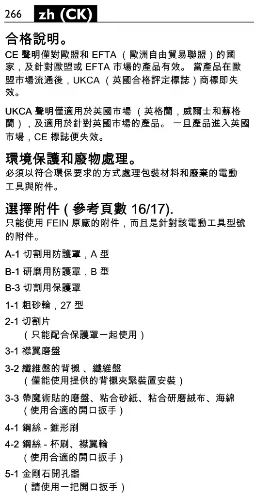 환경 보호 , 처리 . 포장재 , 폐기용 전동공구 및 액세서리는 친환경적인 방법 으로 재활용할 수 있도록 분류해야 합니다 . 액세서리 선택 (16/17 면 참조 ). FEIN 순정 액세서리만을 사용하십시오 . 액세서리는 전 동공구 모델에 맞는 것이어야 합니다 . A-1 절단용 안전 커버 , 타입 A B-1 연마용 안전 커버 , 타입 B B-3 절단용 안전 커버 1-1 러핑 디스크 , 타입 27 2-1 절단 디스크 ( 반드시 조립된 손 보호대와 함께 사용하십시오 ) 3-1 플랩 디스크 3-2 파이버 샌딩 시트용 샌딩 패드 , 파이버 샌딩 시트 ( 함께 공급되는 샌딩 패드 고정부품만 사용하여