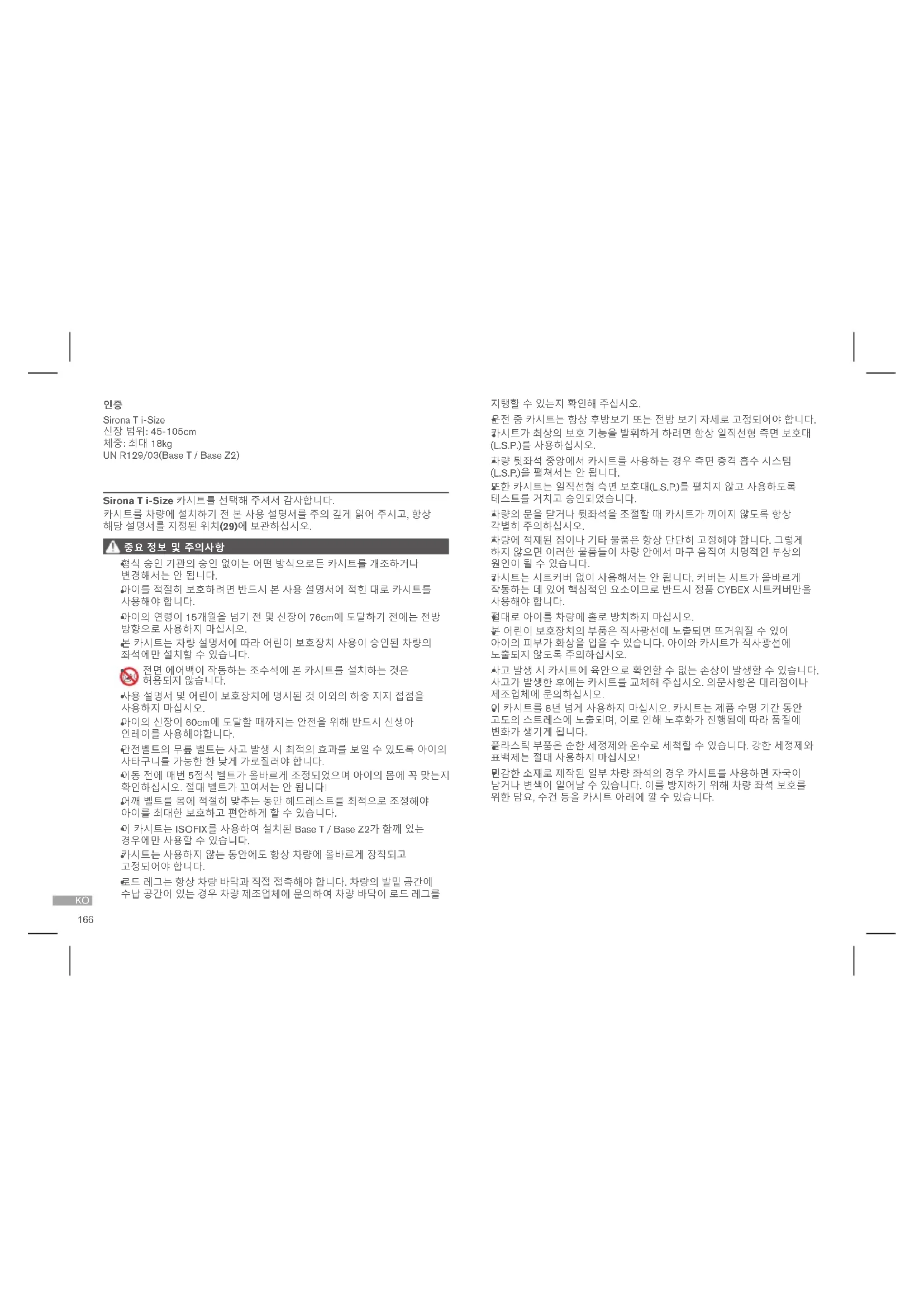 Sirona T i-Size 카시트를 선택해 주셔서 감사합니다. 카시트를 차량에 설치하기 전 본 사용 설명서를 주의 깊게 읽어 주시고, 항상 해당 설명서를 지정된 위치(29)에 보관하십시오. 중요 정보 및 주의사항