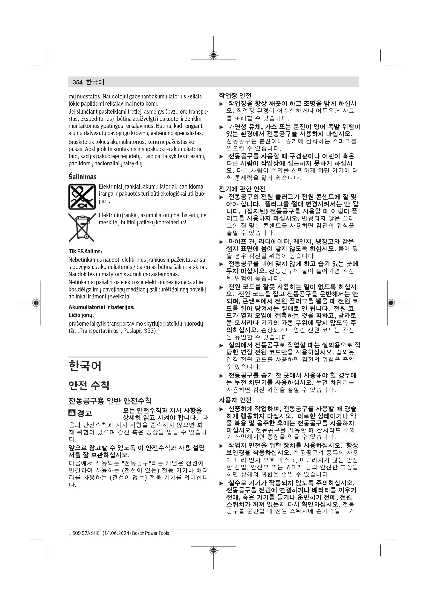 전동공구와 충전용 배터리/배터리를 가 정용 쓰레기로 처리하지 마십시오! 충전용 배터리/배터리: