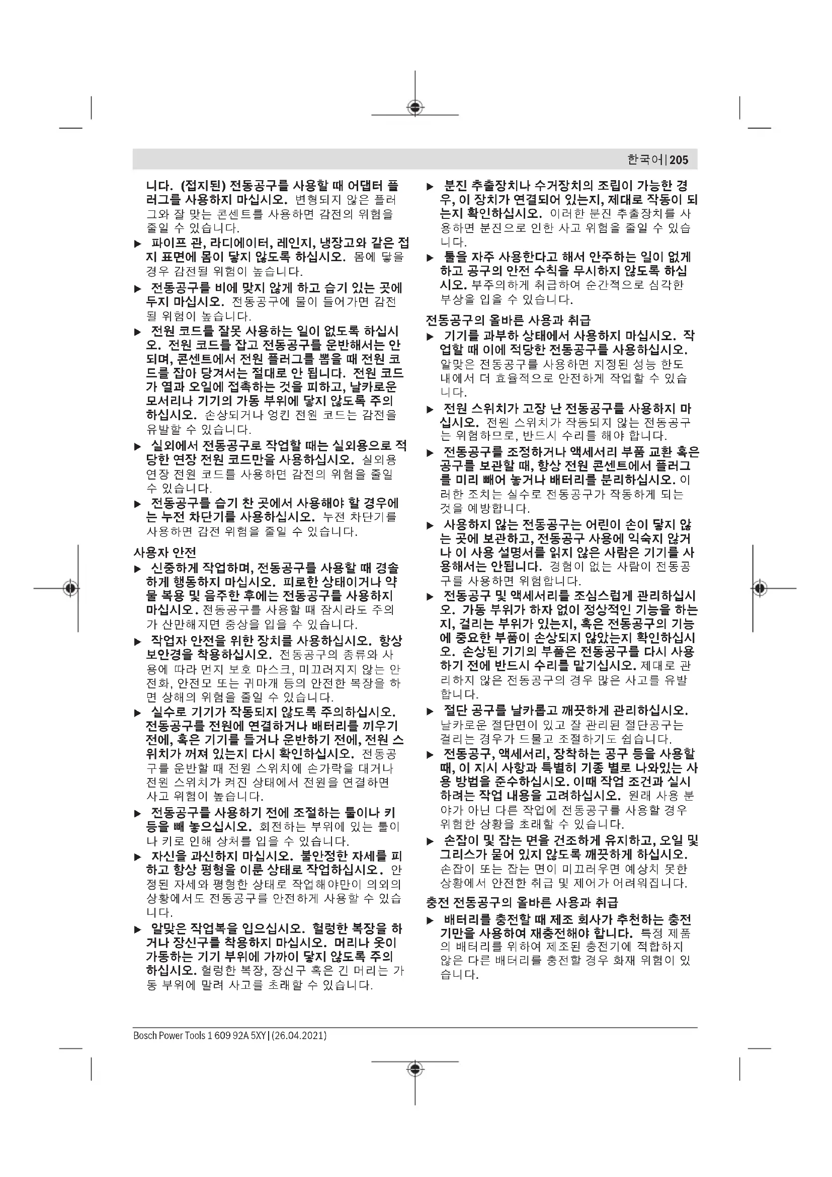 Bosch Power Tools 1 609 92A 5XY | (26.04.2021)206 | 한국어 u 각 전동공구용으로 나와있는 배터리만을 사용하 십시오. 다른 종류의 배터리를 사용하면 상해를 입거나 화재를 초래할 수 있습니다. u 배터리를 사용하지 않을 때는, 각 극을 자극 할 수 있는 페이퍼 클립, 동전, 열쇠, 못, 나사 등 유사한 금속성 물체와 멀리하여 보관하십시오. 배터리 극 사이에 쇼트가 일어나 화상을 입거나 화재를 야기할 수 있습니다. u 배터리를 잘못 사용하면 누수가 생길 수 있습니 다. 누수가 생긴 배터리에 닿지 않도록 하십시오. 피부에 접촉하게 되었을 경우 즉시 물로 씻으십 시오. 유체가 눈에 닿았을 경우 바로 의사와 상담 하십시오. 배터리에서 나오는 유체는 피부에 자 극을 주거나 화상을 입힐 수 있습니다. u 손상된 배터리 또는 공구를 사용하지 마십시오. 손상되었거나 개조된 배터리는 예기치 못한 특성 으로 인해 화재, 폭발 또는 부상의 위험을 초래할