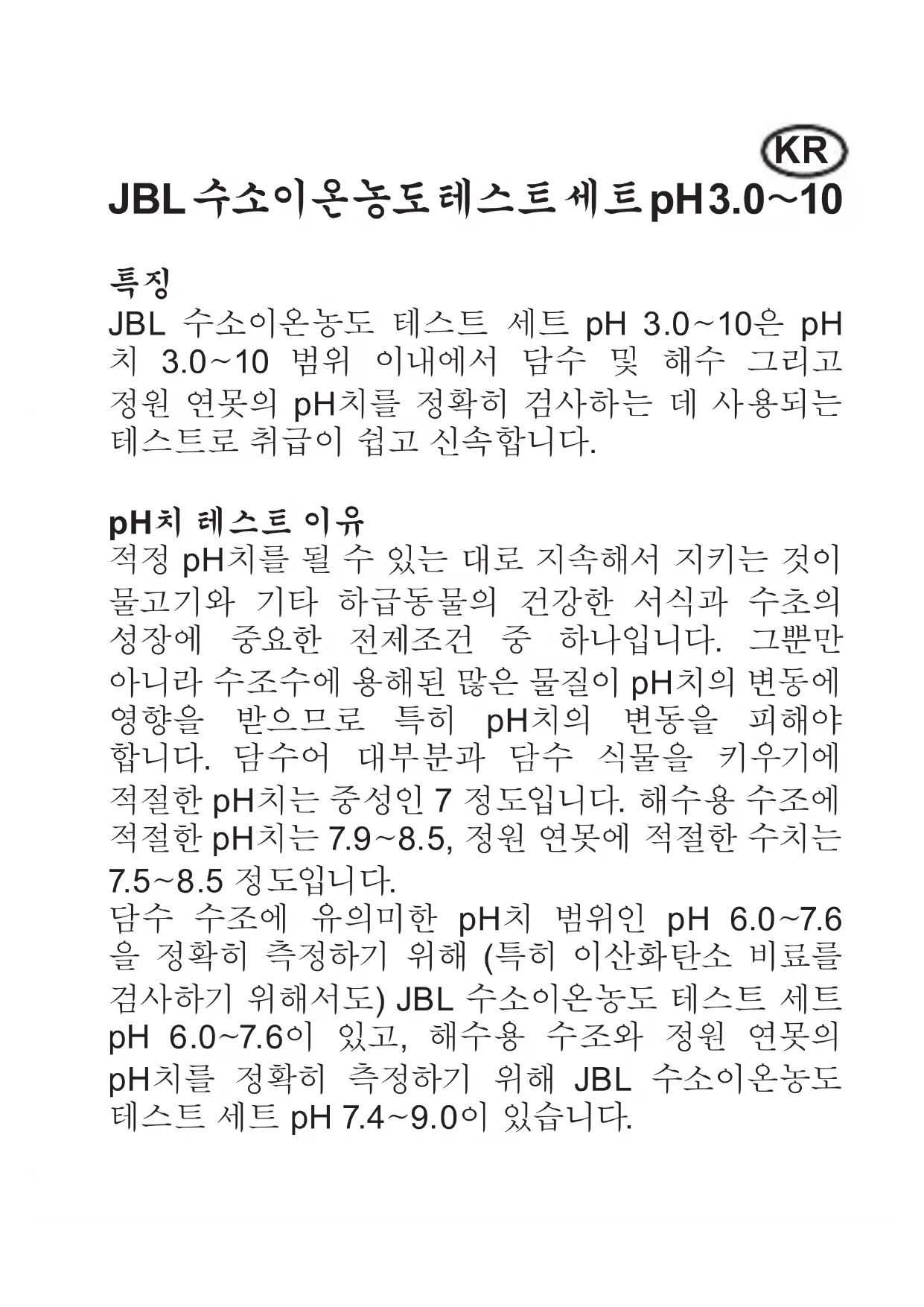 JBL 수소이온농도 테스트 세트 pH 3.0~10은 pH 치 3.0~10 범위 이내에서 담수 및 해수 그리고 정원 연못의 pH치를 정확히 검사하는 데 사용되는 테스트로 취급이 쉽고 신속합니다. pH치 테스트 이유 적정 pH치를 될 수 있는 대로 지속해서 지키는 것이 물고기와 기타 하급동물의 건강한 서식과 수초의 성장에 중요한 전제조건 중 하나입니다. 그뿐만 아니라 수조수에 용해된 많은 물질이 pH치의 변동에 영향을 받으므로 특히 pH치의 변동을 피해야 합니다. 담수어 대부분과 담수 식물을 키우기에 적절한 pH치는 중성인 7 정도입니다. 해수용 수조에 적절한 pH치는 7.9~8.5, 정원 연못에 적절한 수치는 7.5~8.5 정도입니다. 담수 수조에 유의미한 pH치 범위인 pH 6.0~7.6 을 정확히 측정하기 위해 (특히 이산화탄소 비료를 검사하기 위해서도) JBL 수소이온농도 테스트 세트 pH 6.0~7.6이 있고, 해수용 수조와 정원 연못의 pH치를 정확히 측정하기 위해 JBL 수소이온농도 테스트 세트 pH 7.4~9.0이 있습니다.KR pH치가 적절하 지 않을 경우의 해결방법
