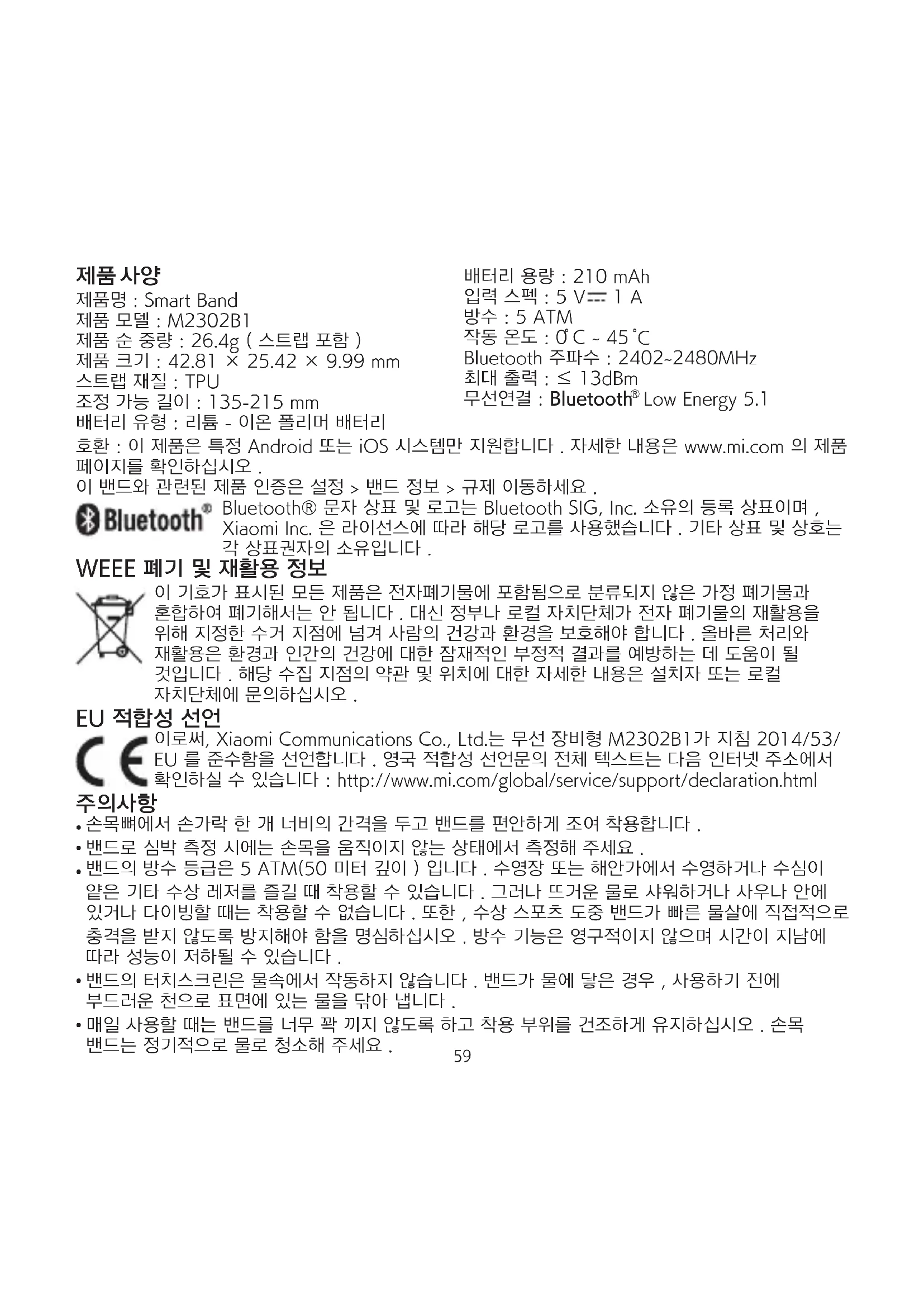 詳細については、www.mi.com をご覧ください。 58호환 : 이 제품은 특정 Android 또는 iOS 시스템만 지원합니다 . 자세한 내용은 www.mi.com 의 제품 페이지를 확인하십시오 . 이 밴드와 관련된 제품 인증은 설정 > 밴드 정보 > 규제 이동하세요 . Bluetooth® 문자 상표 및 로고는 Bluetooth SIG, Inc. 소유의 등록 상표이며 , Xiaomi Inc. 은 라이선스에 따라 해당 로고를 사용했습니다 . 기타 상표 및 상호는 각 상표권자의 소유입니다 . WEEE 폐기 및 재활용 정보 이 기호가 표시된 모든 제품은 전자폐기물에 포함됨으로 분류되지 않은 가정 폐기물과 혼합하여 폐기해서는 안 됩니다 . 대신 정부나 로컬 자치단체가 전자 폐기물의 재활용을 위해 지정한 수거 지점에 넘겨 사람의 건강과 환경을 보호해야 합니다 . 올바른 처리와 재활용은 환경과 인간의 건강에 대한 잠재적인 부정적 결과를 예방하는 데 도움이 될 것입니다 . 해당 수집 지점의 약관 및 위치에 대한 자세한 내용은 설치자 또는 로컬 자치단체에 문의하십시오 . EU 적합성 선언 이로써, Xiaomi Communications Co., Ltd.는 무선 장비형 M2302B1가 지침 2014/53/ EU 를 준수함을 선언합니다 . 영국 적합성 선언문의 전체 텍스트는 다음 인터넷 주소에서 확인하실 수 있습니다 : http://www.mi.com/global/service/support/declaration.html
