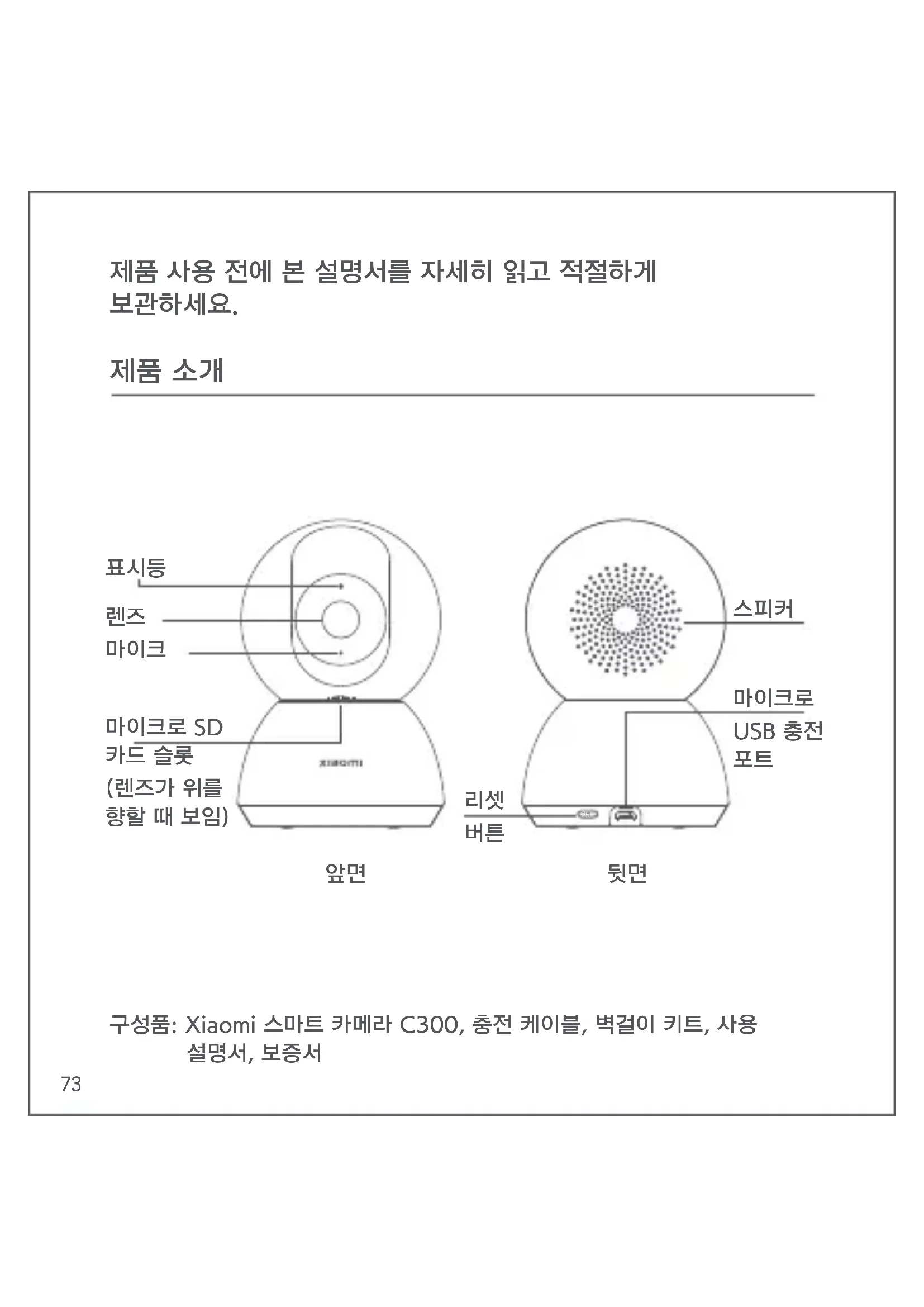 구성품: Xiaomi 스마트 카메라 C300, 충전 케이블, 벽걸이 키트, 사용