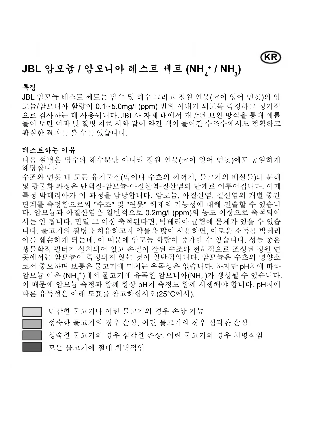 )가 생성될 수 있습니다. 이 때문에 암모늄 측정과 함께 항상 pH치 측정도 함께 시행해야 합니다. pH치에 따른 유독성은 아래 도표를 참고하십시오(25°C에서). 민감한 물고기나 어린 물고기의 경우 손상 가능 성숙한 물고기의 경우 손상, 어린 물고기의 경우 심각한 손상 성숙한 물고기의 경우 심각한 손상, 어린 물고기의 경우 치명적임 모든 물고기에 절대 치명적임KR