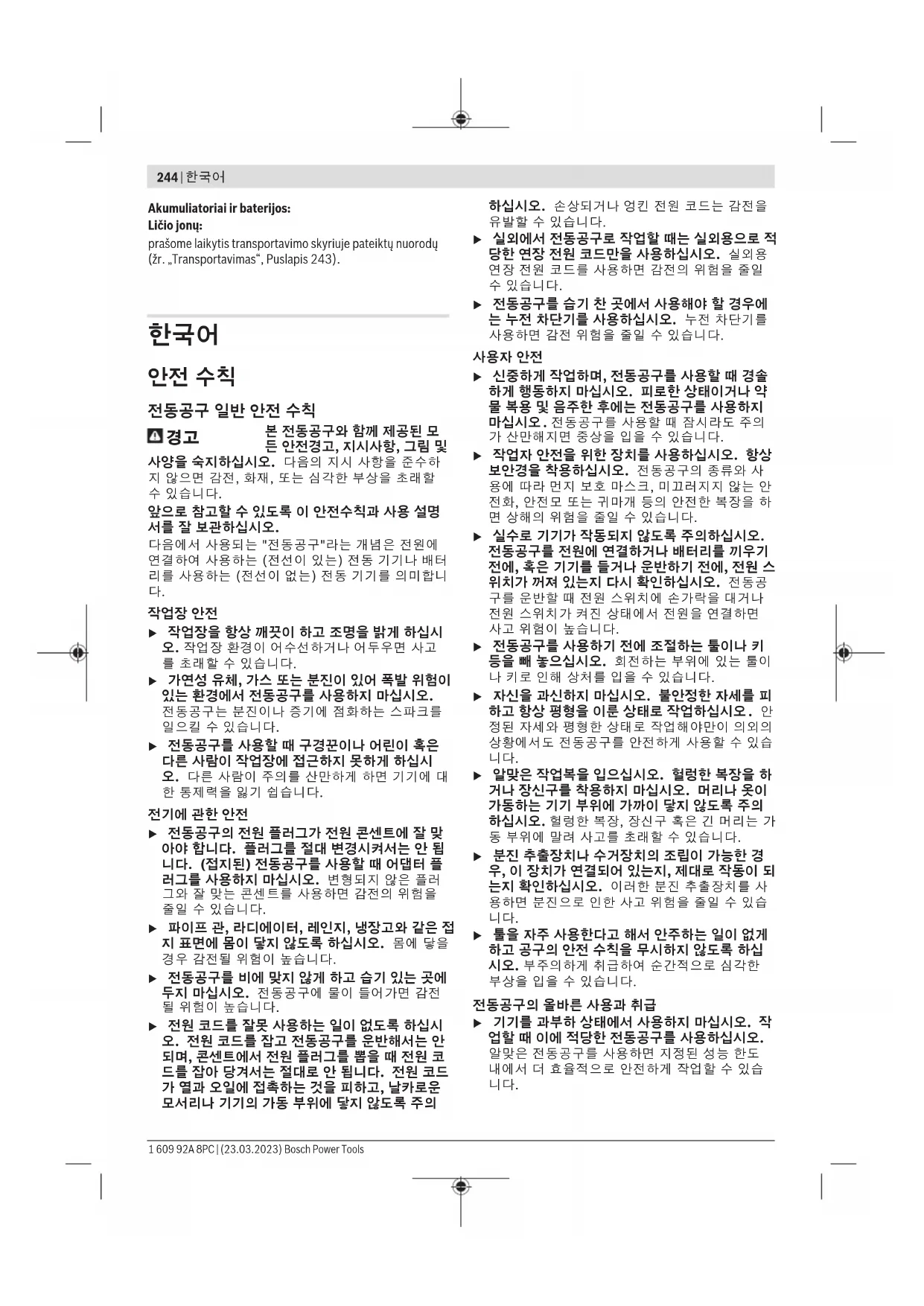 1 609 92A 8PC | (23.03.2023) Bosch Power Tools한국어 | 245 u 전원 스위치가 고장 난 전동공구를 사용하지 마 십시오. 전원 스위치가 작동되지 않는 전동공구 는 위험하므로, 반드시 수리를 해야 합니다. u 전동공구를 조정하거나 액세서리 부품 교환 혹은 공구를 보관할 때, 항상 전원 콘센트에서 플러그 를 미리 빼어 놓거나 배터리를 분리하십시오. 이 러한 조치는 실수로 전동공구가 작동하게 되는